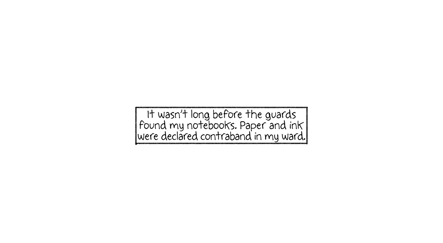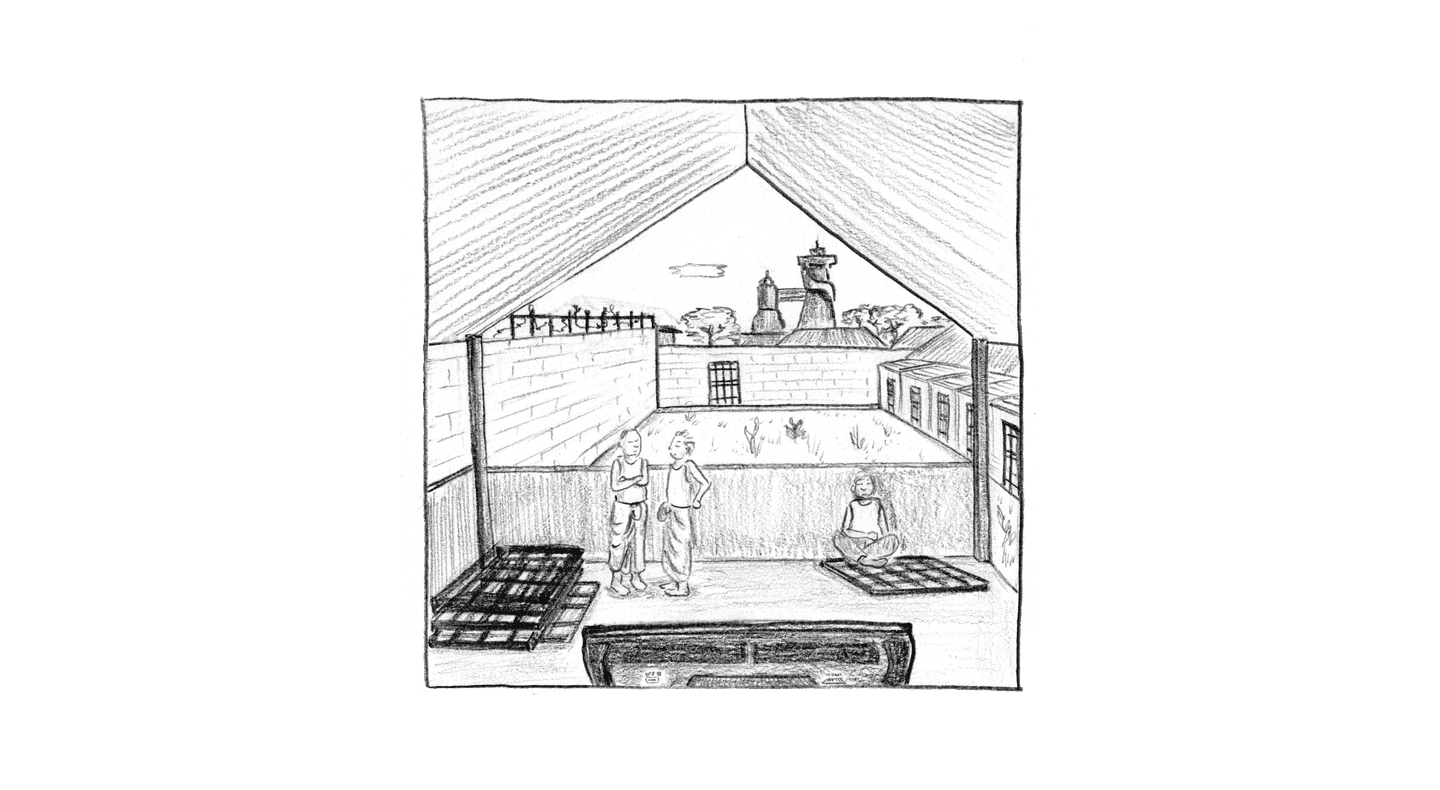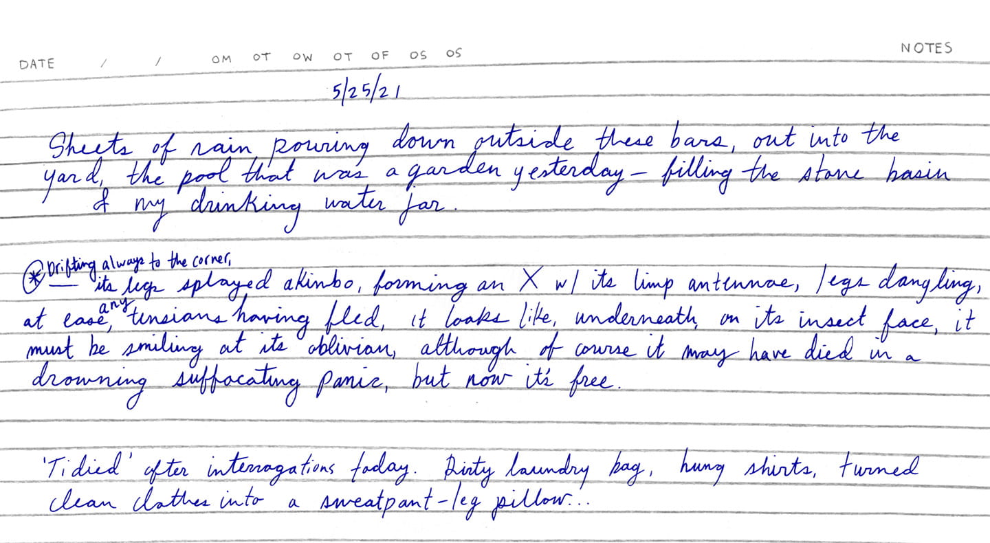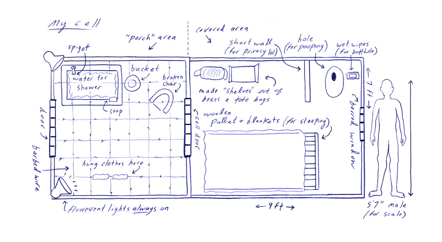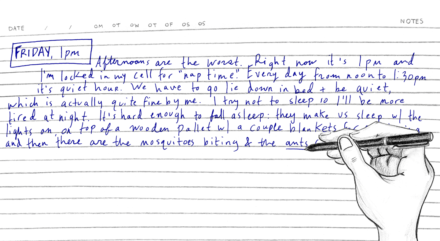 “FRIDAY, 1pm Afternoons are the worst. Right now it's 1pm and I'm locked in my cell for ‘nap time.’ Every day from noon to 1:30pm it's quiet hour. We have to go lie down in bed and be quiet, which is actually quite fine by me. I try not to sleep so l'll be more tired at night. It's hard enough to fall asleep: they make us sleep with the light on, on top of a wooden pallet with a couple of blankets for padding. And then there are the mosquitoes biting and the ants…”