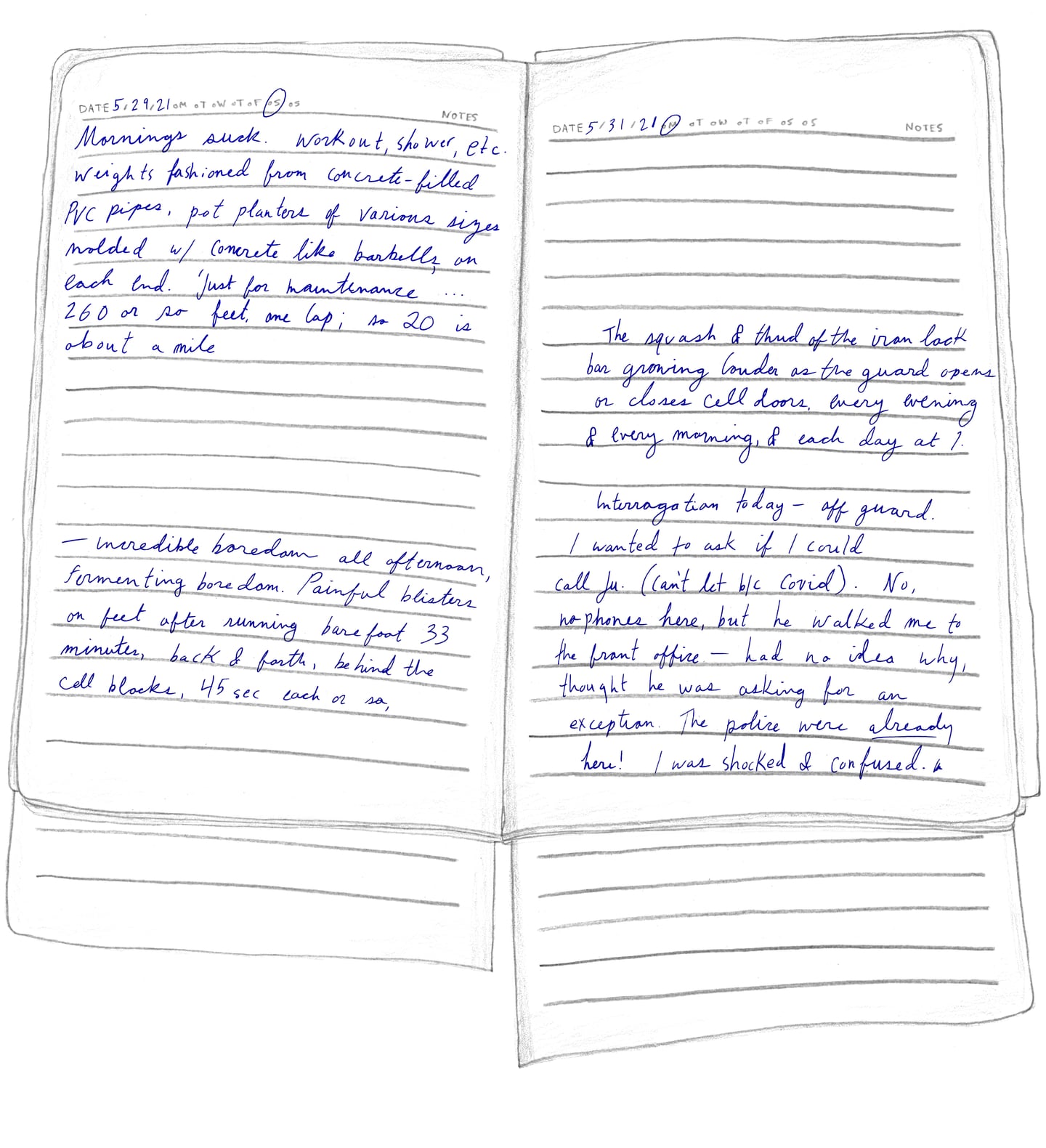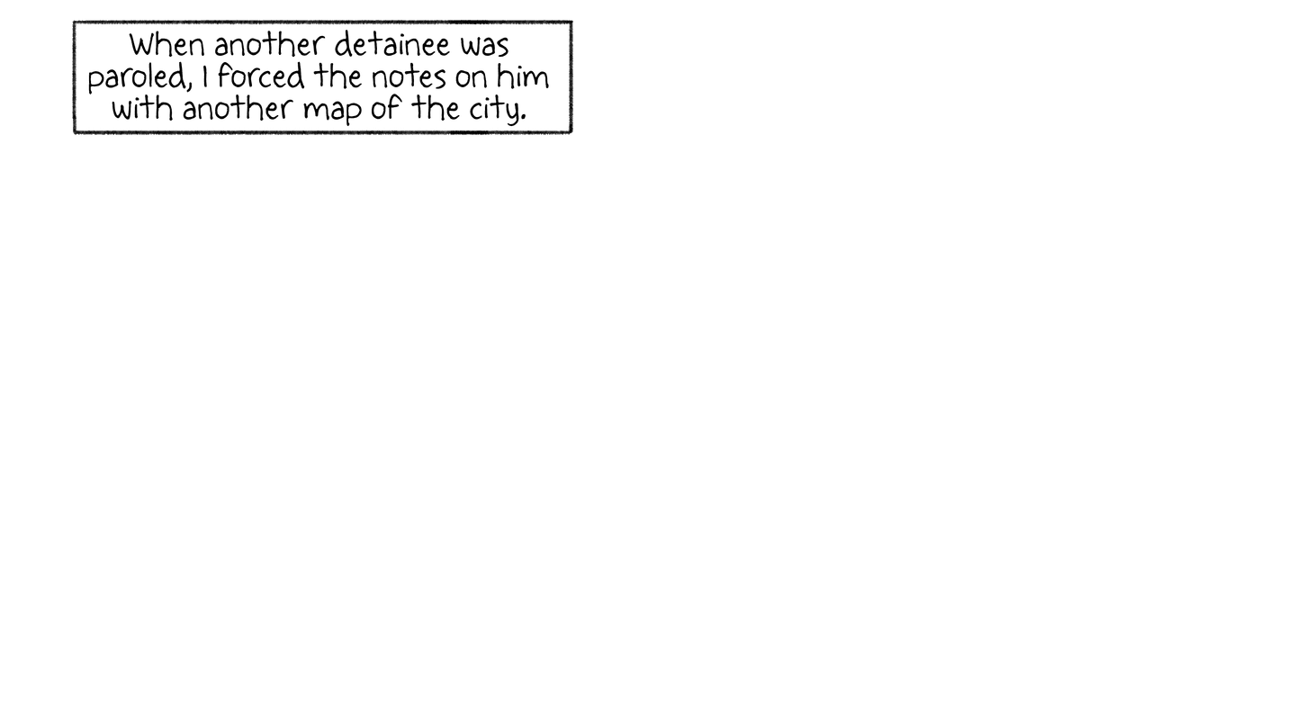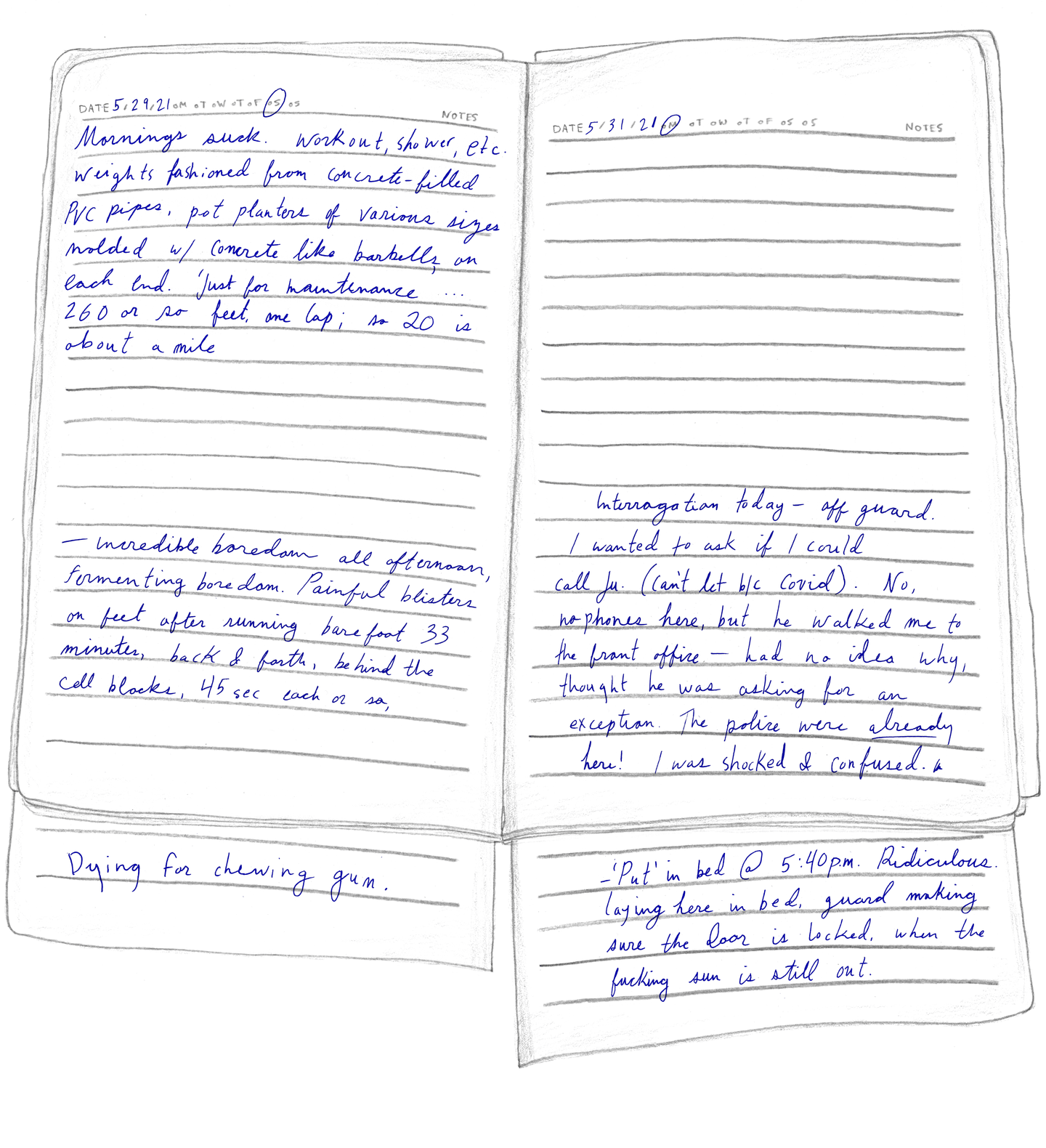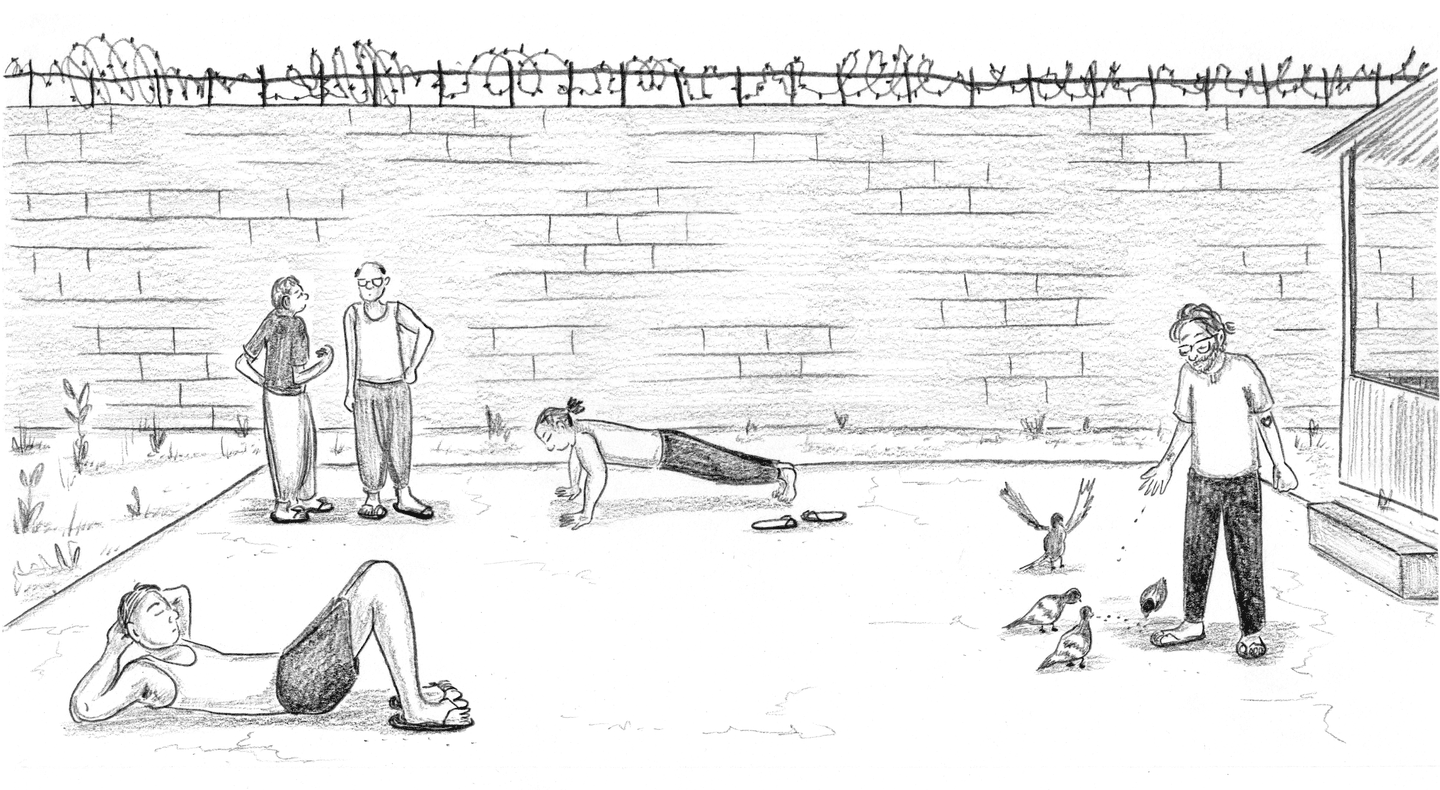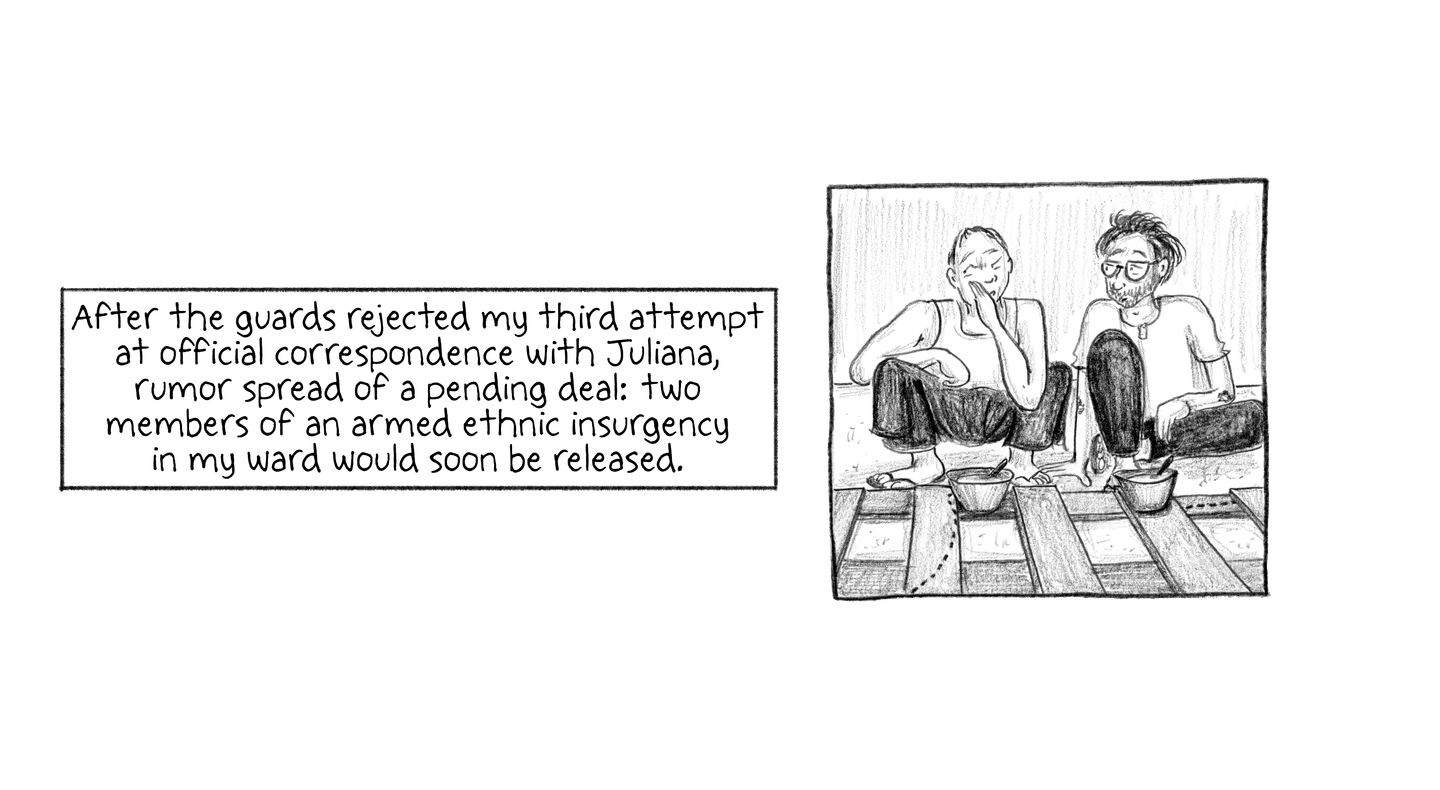 “FRIDAY, 1pm Afternoons are the worst. Right now it's 1pm and I'm locked in my cell for ‘nap time.’ Every day from noon to 1:30pm it's quiet hour. We have to go lie down in bed and be quiet, which is actually quite fine by me. I try not to sleep so l'll be more tired at night. It's hard enough to fall asleep: they make us sleep with the light on, on top of a wooden pallet with a couple of blankets for padding. And then there are the mosquitoes biting and the ants…”