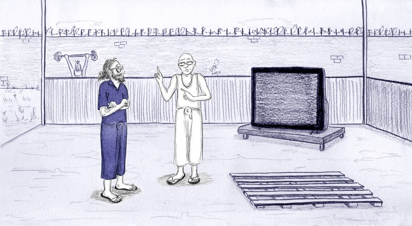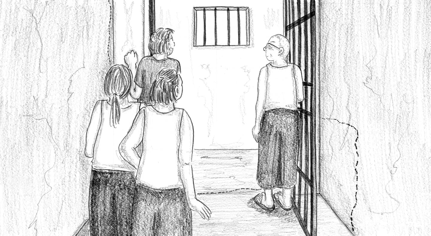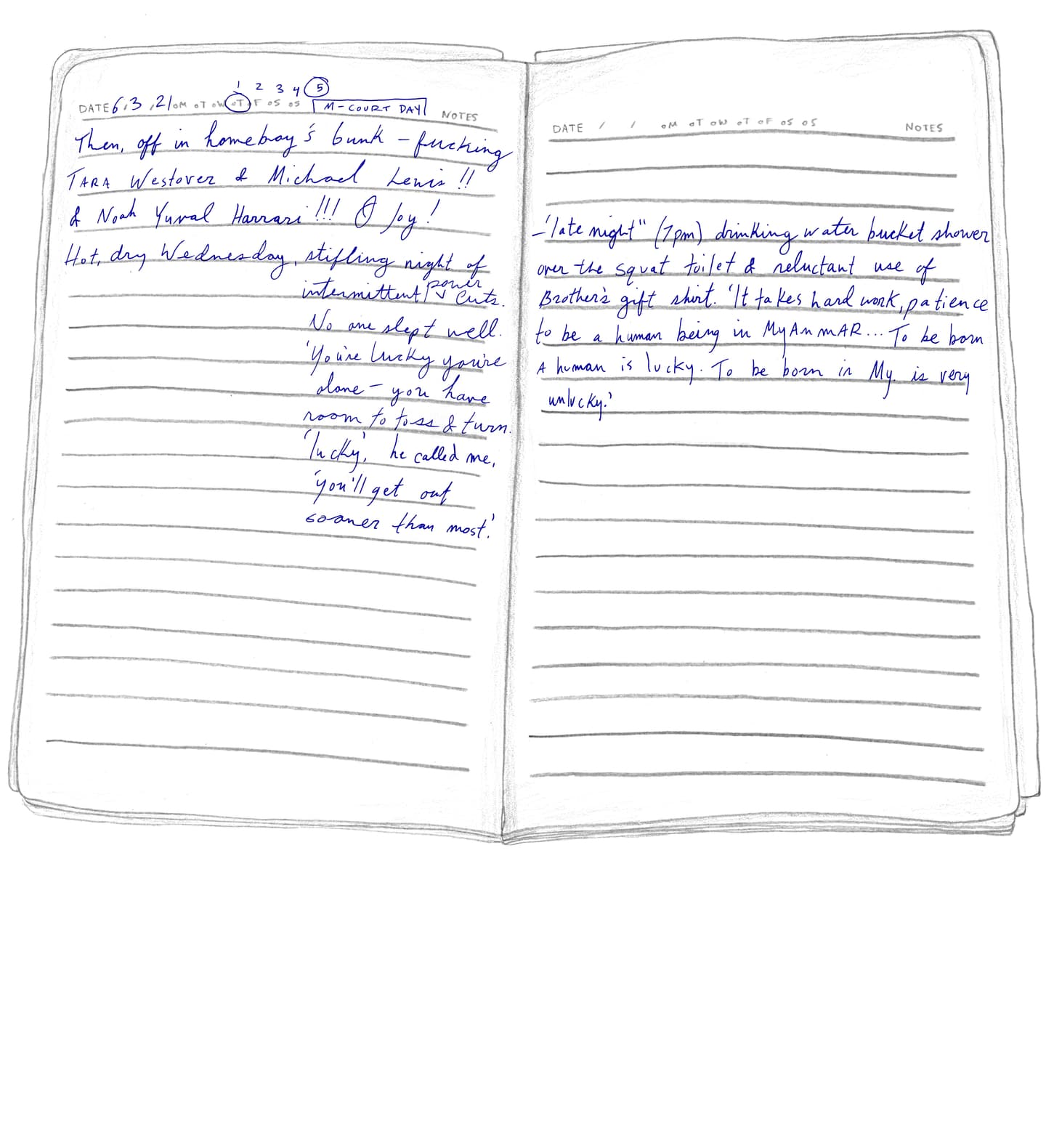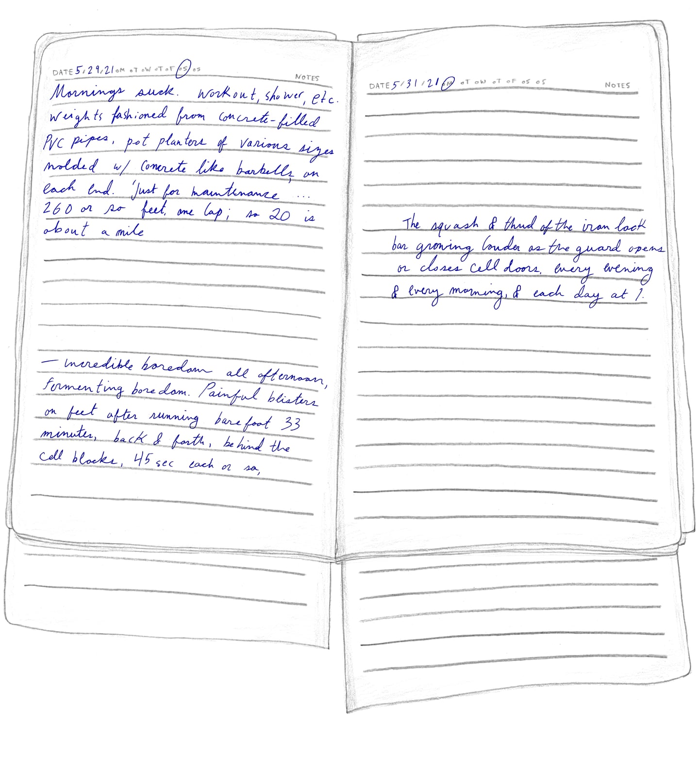 “FRIDAY, 1pm Afternoons are the worst. Right now it's 1pm and I'm locked in my cell for ‘nap time.’ Every day from noon to 1:30pm it's quiet hour. We have to go lie down in bed and be quiet, which is actually quite fine by me. I try not to sleep so l'll be more tired at night. It's hard enough to fall asleep: they make us sleep with the light on, on top of a wooden pallet with a couple of blankets for padding. And then there are the mosquitoes biting and the ants…”