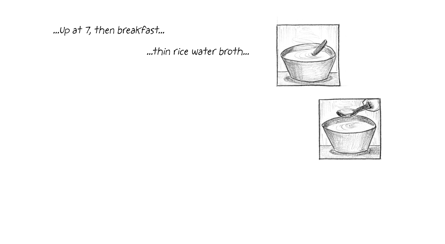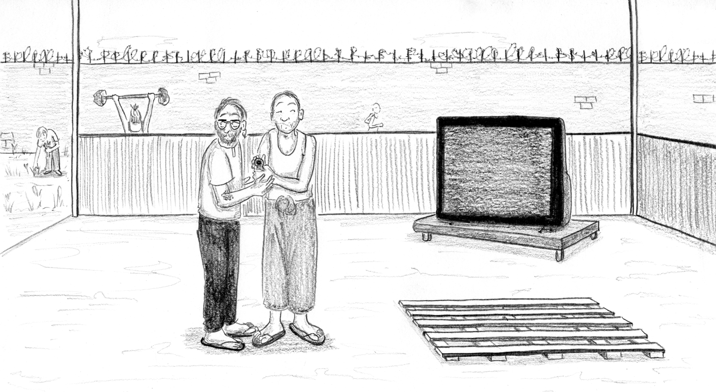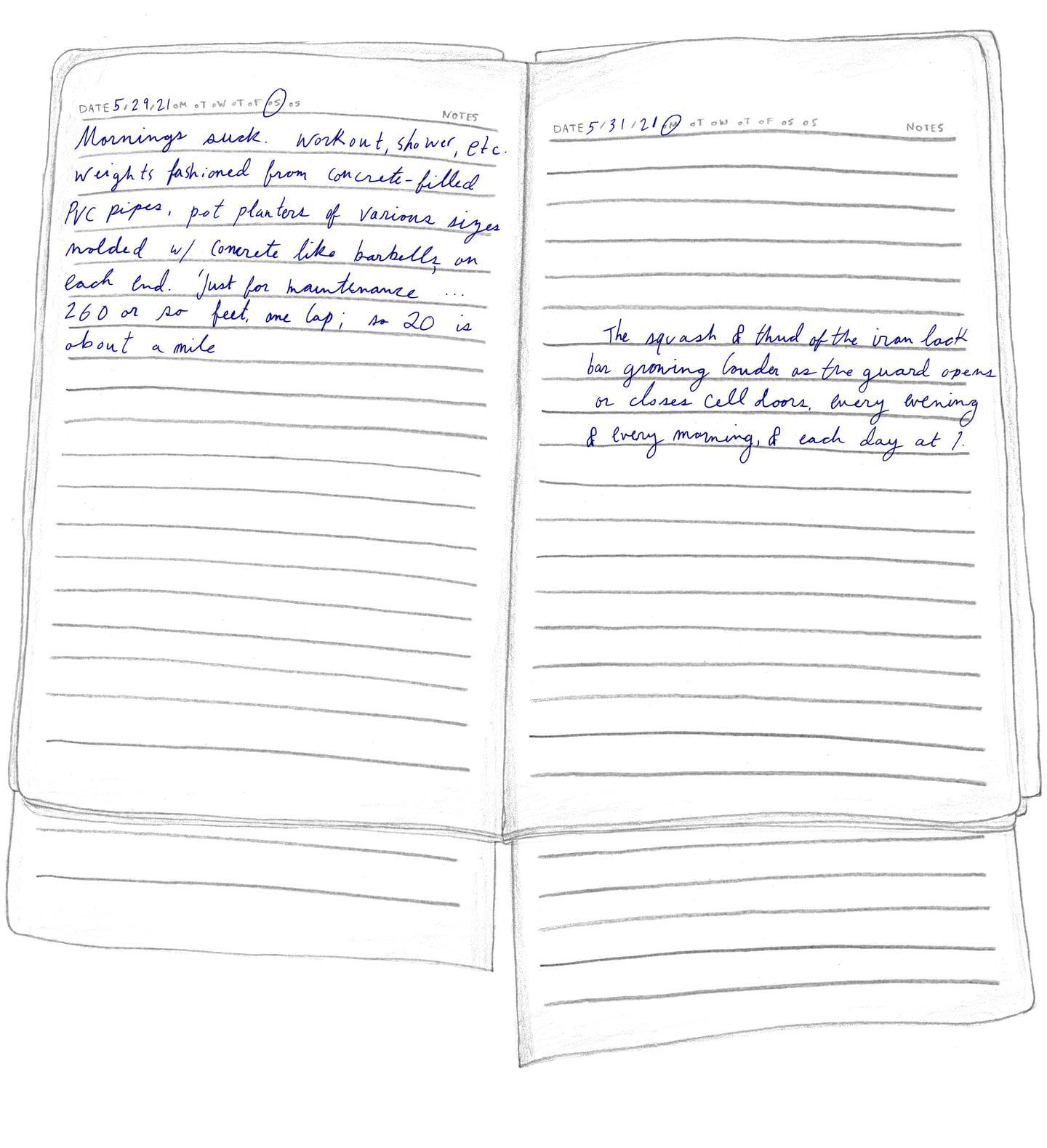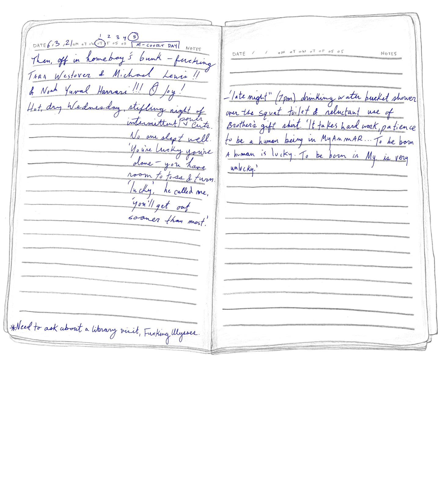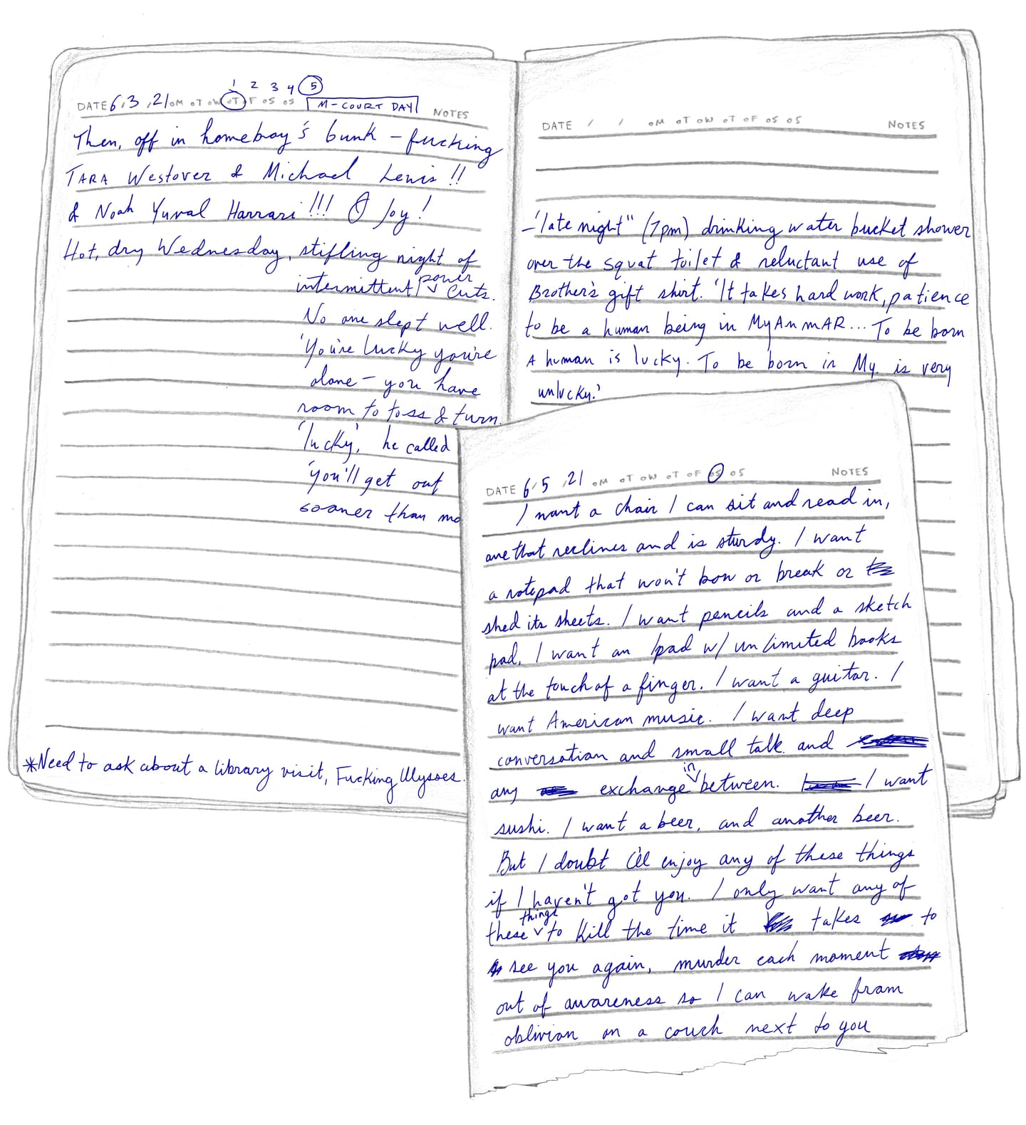 “FRIDAY, 1pm Afternoons are the worst. Right now it's 1pm and I'm locked in my cell for ‘nap time.’ Every day from noon to 1:30pm it's quiet hour. We have to go lie down in bed and be quiet, which is actually quite fine by me. I try not to sleep so l'll be more tired at night. It's hard enough to fall asleep: they make us sleep with the light on, on top of a wooden pallet with a couple of blankets for padding. And then there are the mosquitoes biting and the ants…”