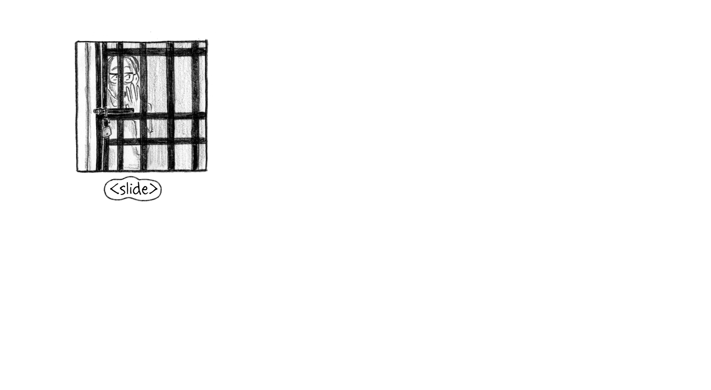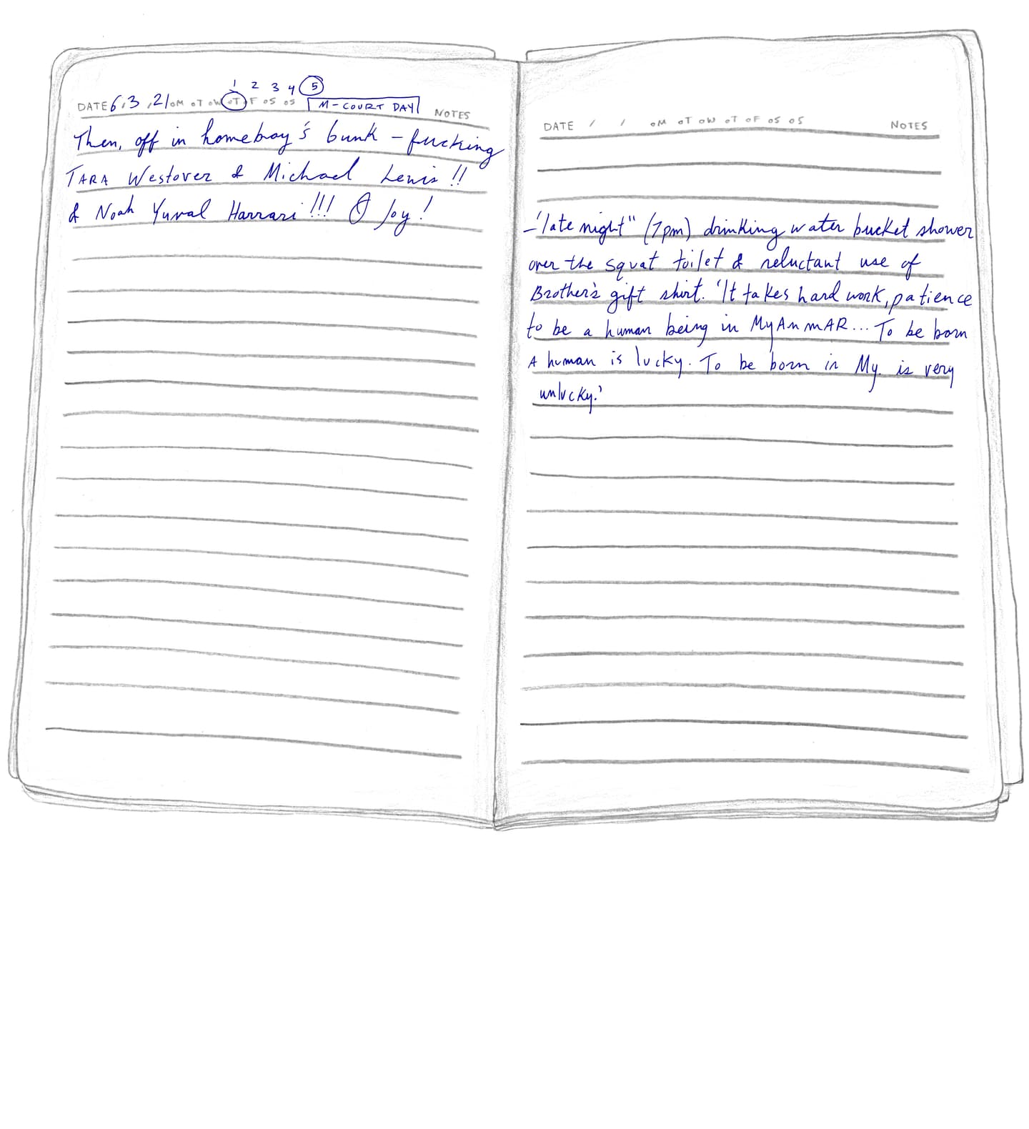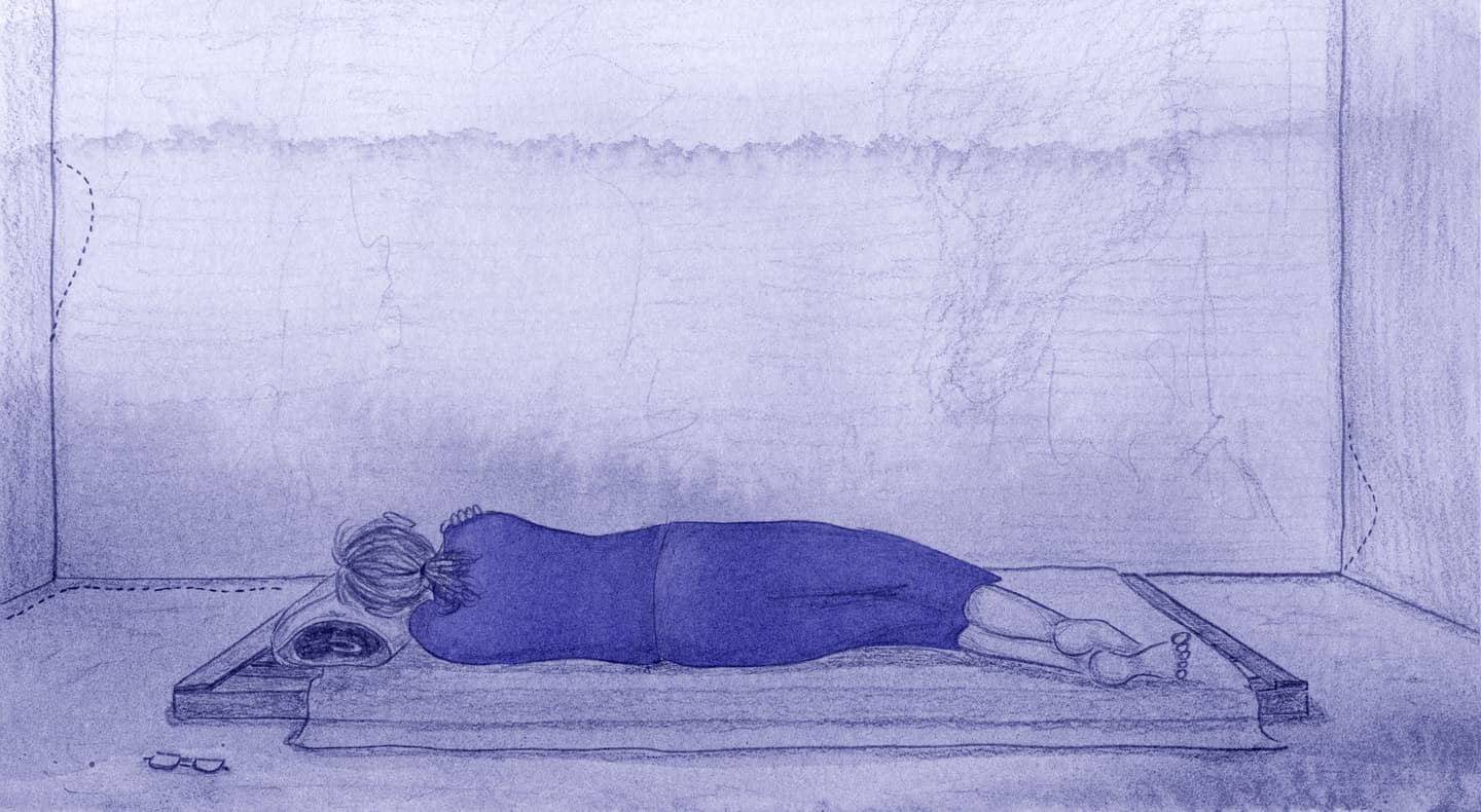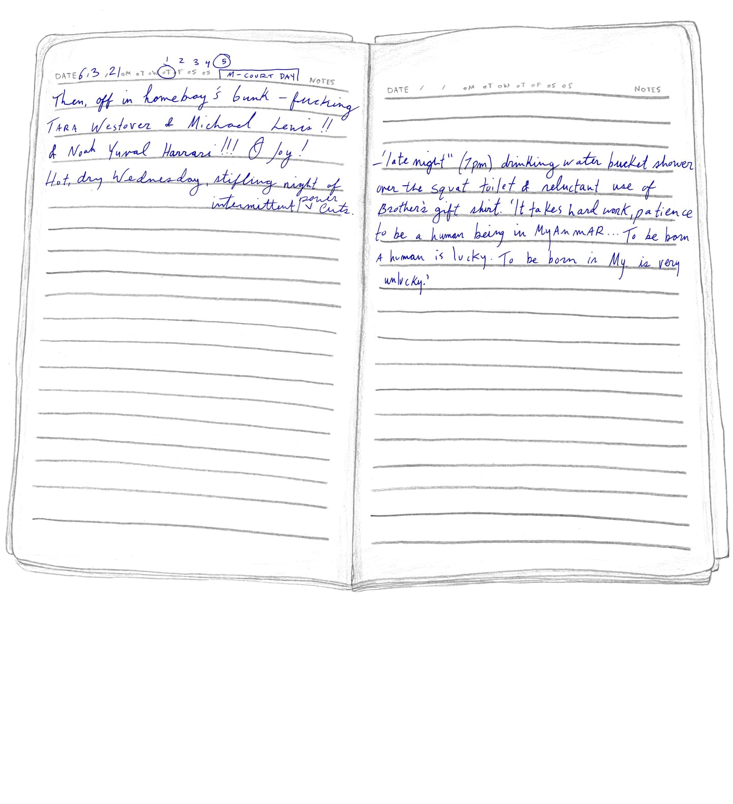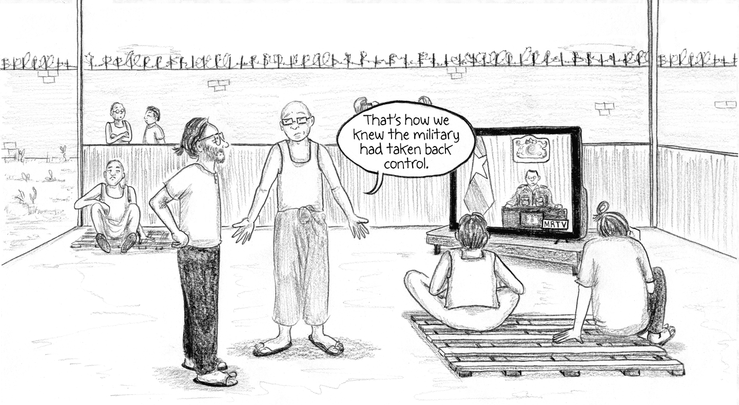 “FRIDAY, 1pm Afternoons are the worst. Right now it's 1pm and I'm locked in my cell for ‘nap time.’ Every day from noon to 1:30pm it's quiet hour. We have to go lie down in bed and be quiet, which is actually quite fine by me. I try not to sleep so l'll be more tired at night. It's hard enough to fall asleep: they make us sleep with the light on, on top of a wooden pallet with a couple of blankets for padding. And then there are the mosquitoes biting and the ants…”
