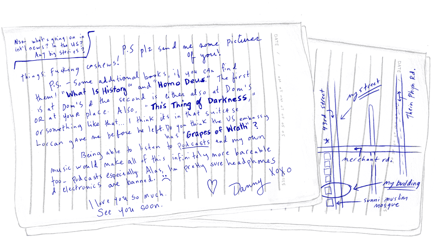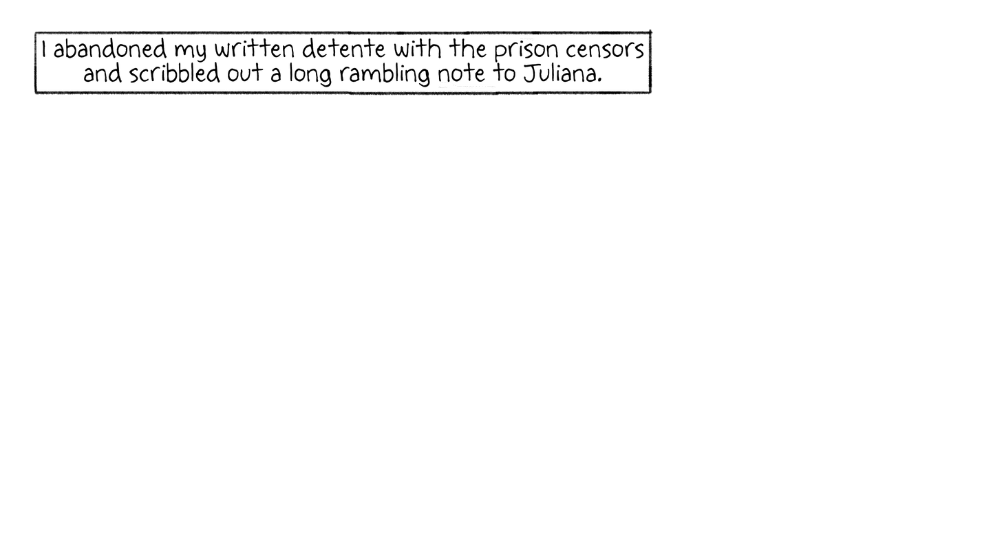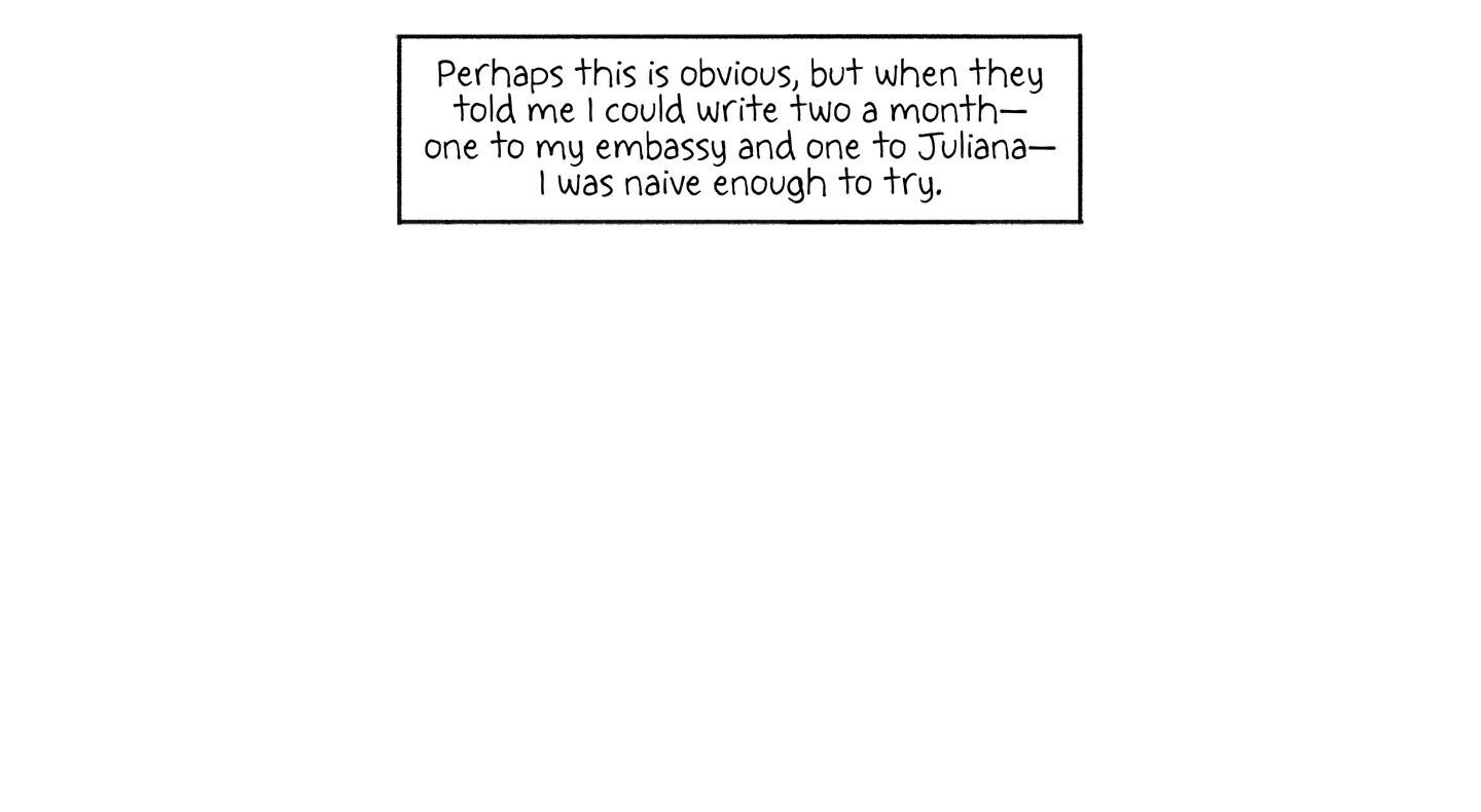 Perhaps this is obvious, but when they told me I could write two a month — one to my embassy and one to Juliana — I was naive enough to try.
