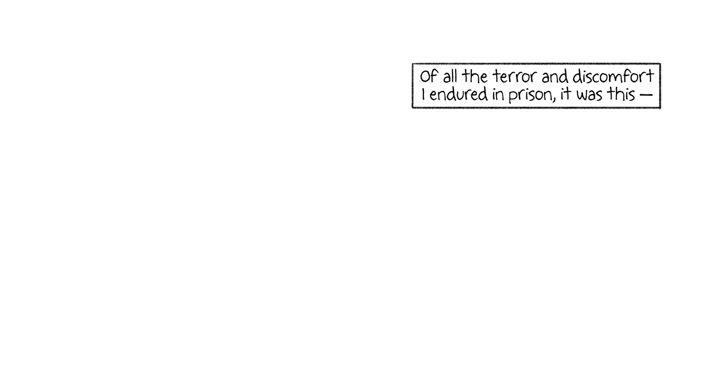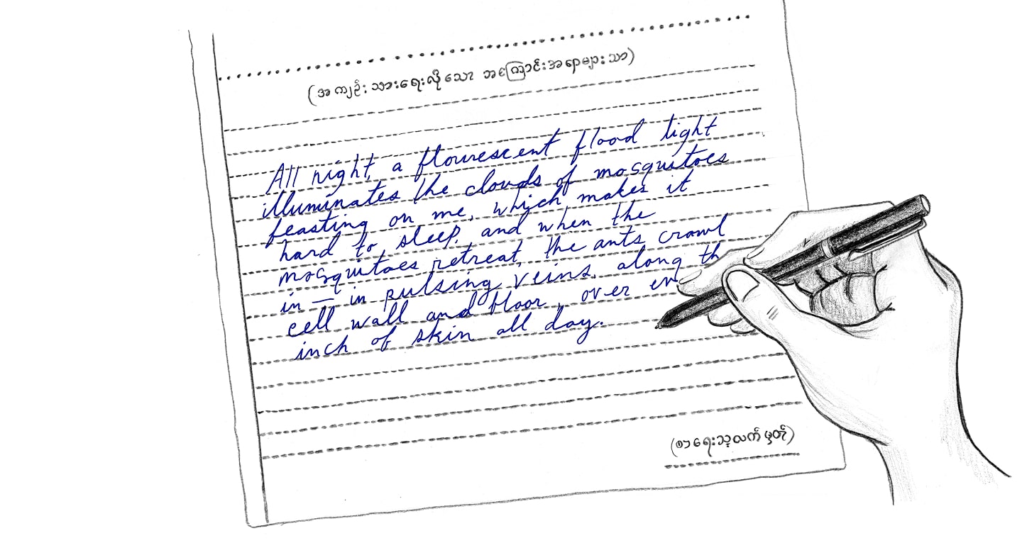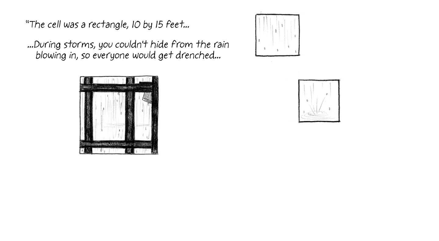 “A fluorescent flood light illuminates the clouds of mosquitoes feasting on me, which makes it hard to sleep, and when the mosquitoes retreat, the ants crawl in — in pulsing veins along the cell wall and floor, over every inch of skin all day.”