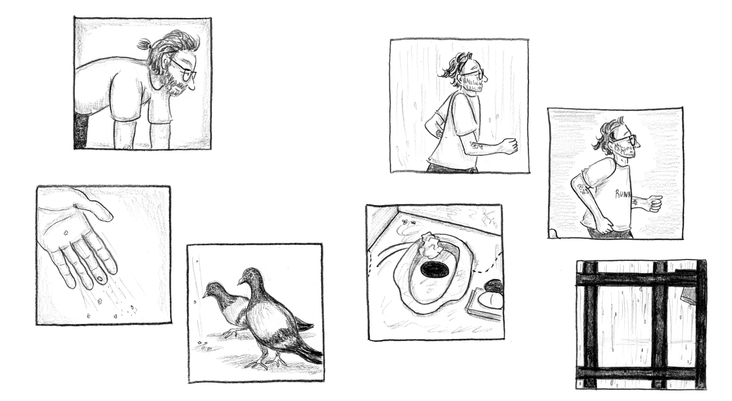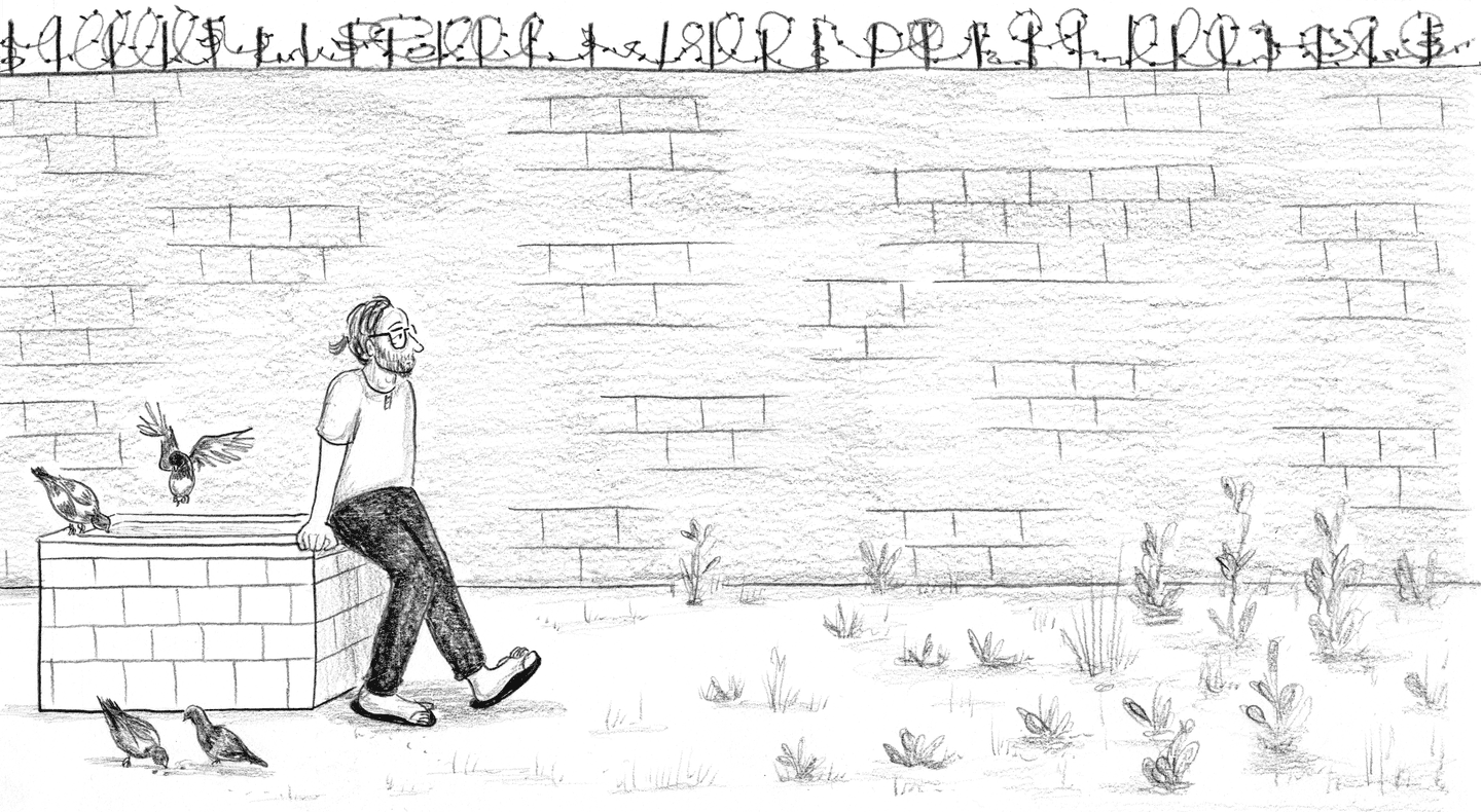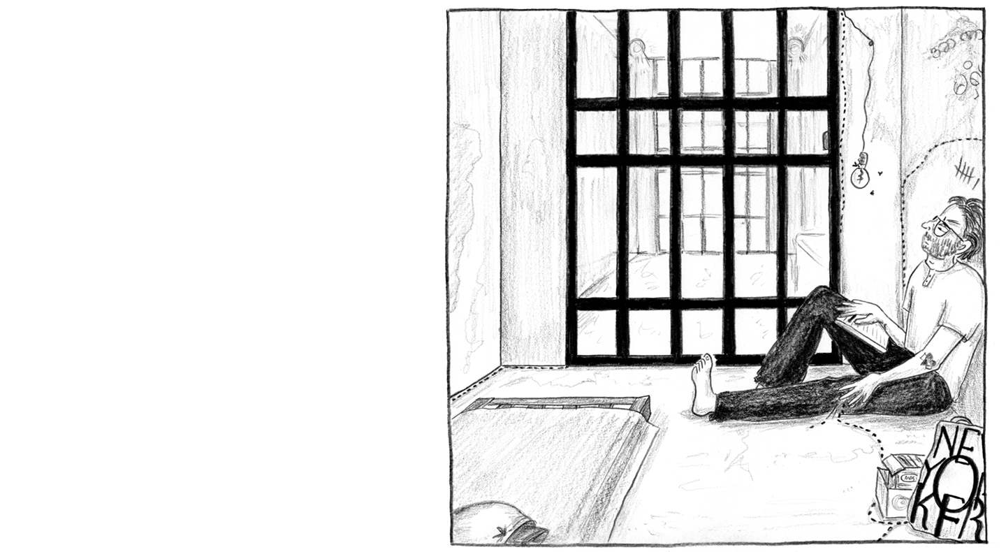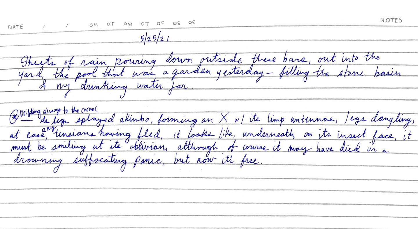“A fluorescent flood light illuminates the clouds of mosquitoes feasting on me, which makes it hard to sleep, and when the mosquitoes retreat, the ants crawl in — in pulsing veins along the cell wall and floor, over every inch of skin all day.”