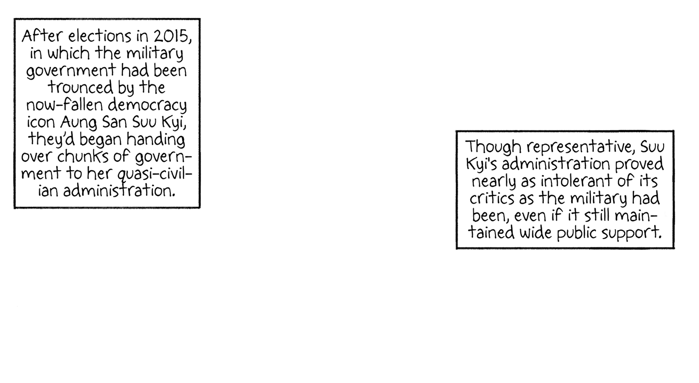 After elections in 2015, in which the military government had been trounced by the now-fallen democracy icon Aung San Suu Kyi, they'd began handing over chunks of government to her quasi-civilian administration.