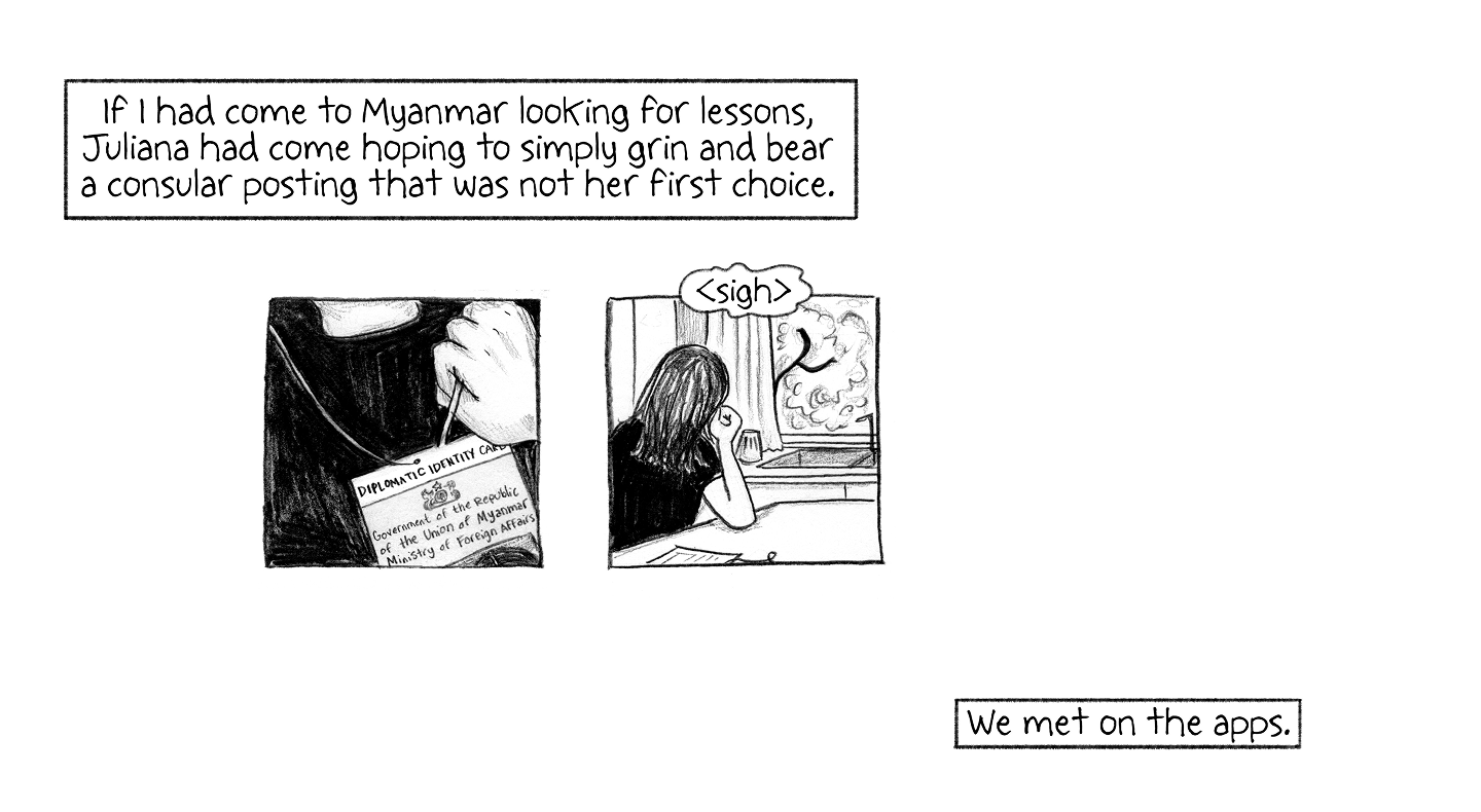 If I had come to Myanmar looking for lessons, Juliana had come hoping to simply grin and bear a consular posting that was not her first choice.