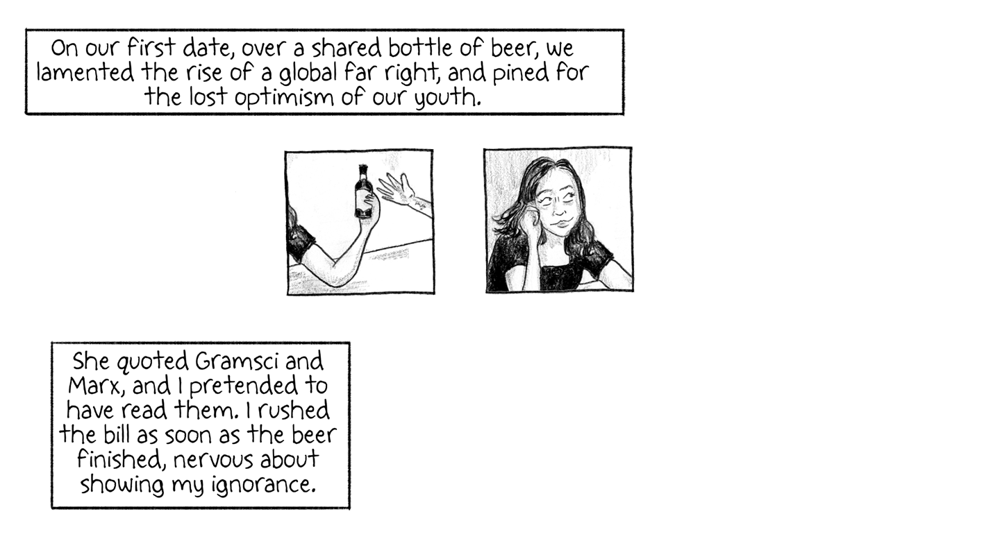 On our first date, over a shared bottle of beer, we lamented the rise of a global far right, and pined for the lost optimism of our youth.