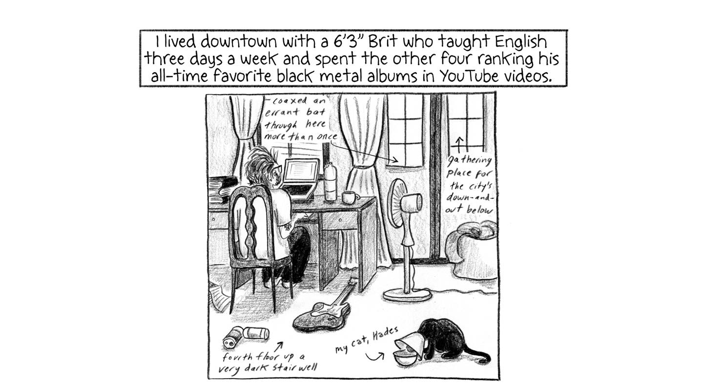 I lived downtown with a 6’3" Brit who taught English three days a week and spent the other four ranking his all-time favorite black metal albums in YouTube videos.