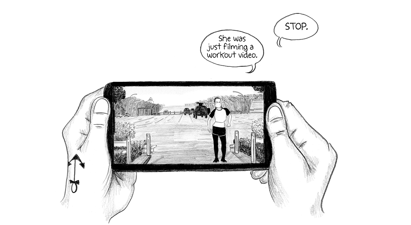 “She was just filming a workout video.” “STOP.” “And there’s THE COUP right behind her!”