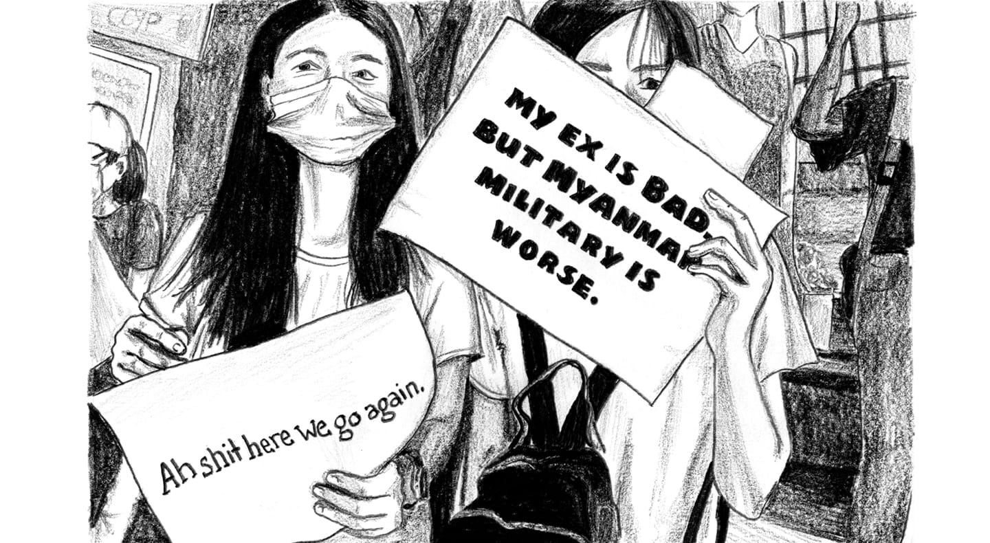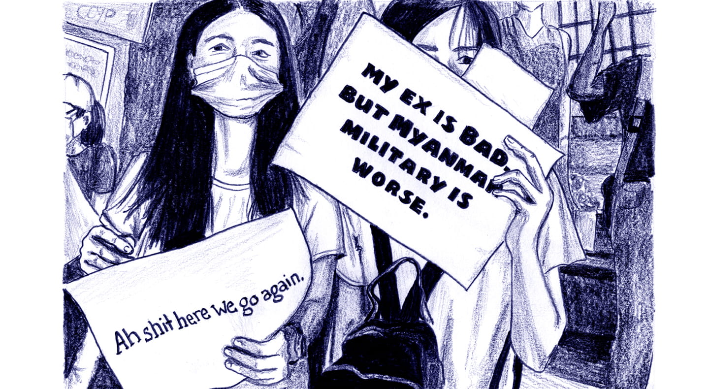 Signs: “My ex is bad but Myanmar military is worse.” “Ah shit here we go again.”