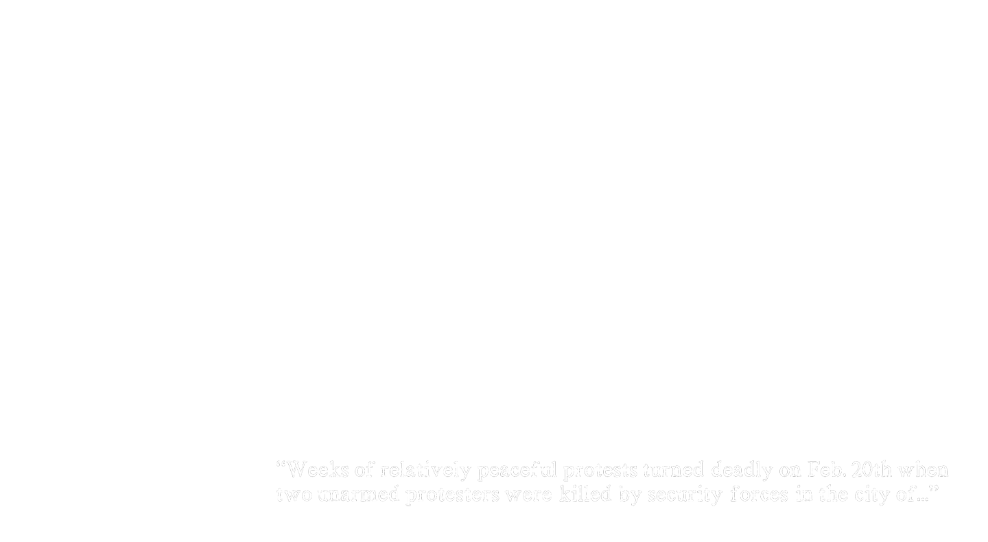 "Weeks of relatively peaceful protests turned deadly on Feb. 20th when two unarmed protesters were killed by security forces in the city of…”