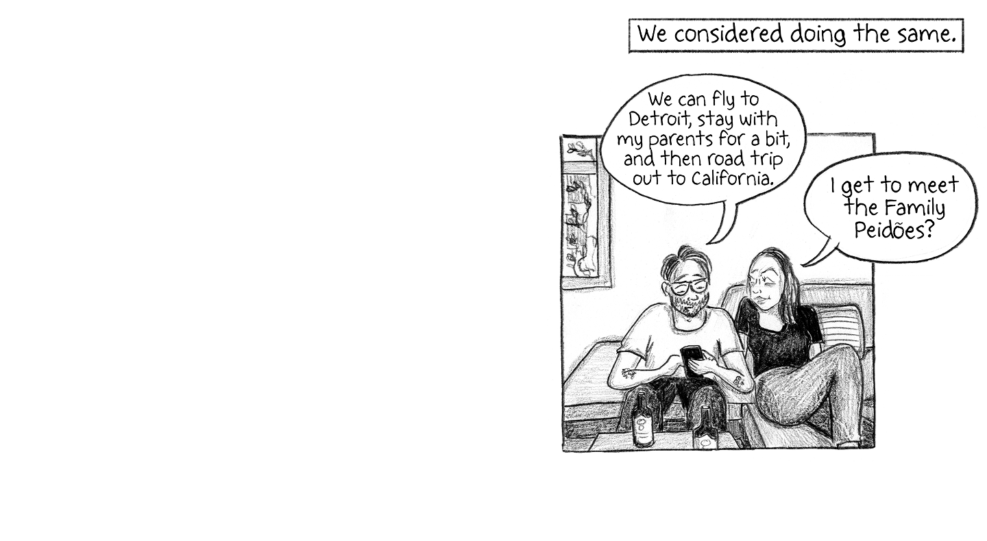 “We can fly to Detroit, stay with my parents for a bit, and then road trip out to California.” “I get to meet the family Peidões?”