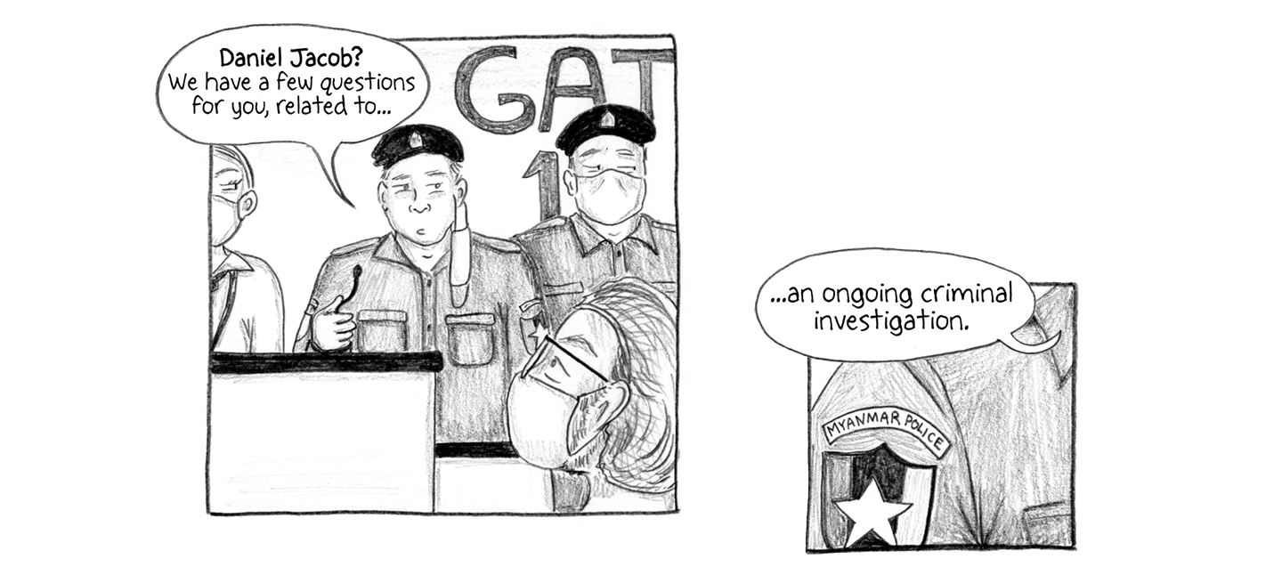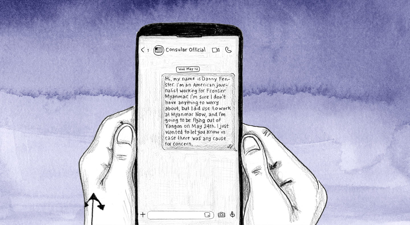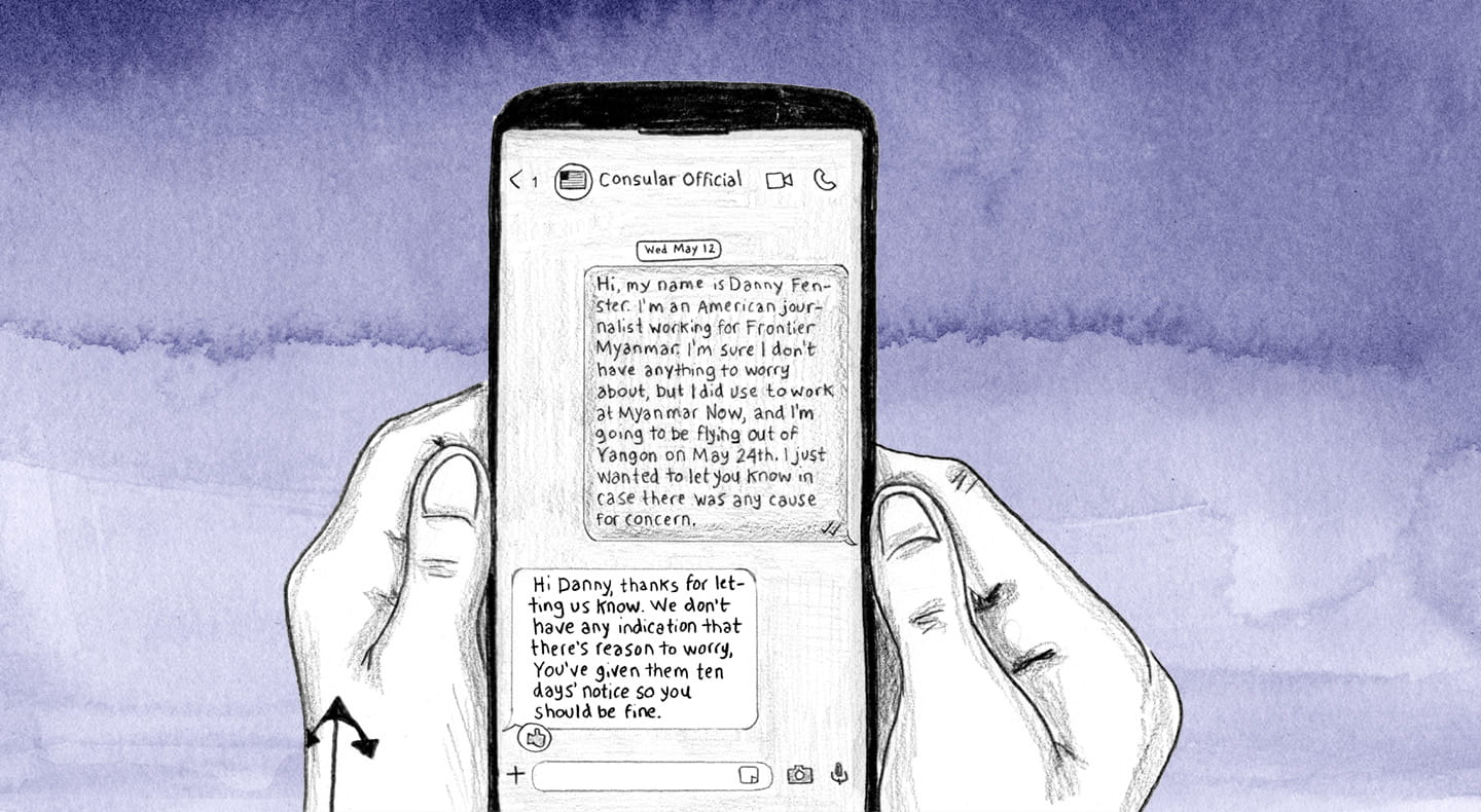 Text to Consular Official: “Hi, my name is Danny Fenster. I'm an American journalist working for Frontier Myanmar. I'm sure I don't have anything to worry about, but I did use to work at Myanmar Now, and I'm going to be flying out of Yangon on May 24th. I just wanted to let you know in case there was any cause for concern.”
