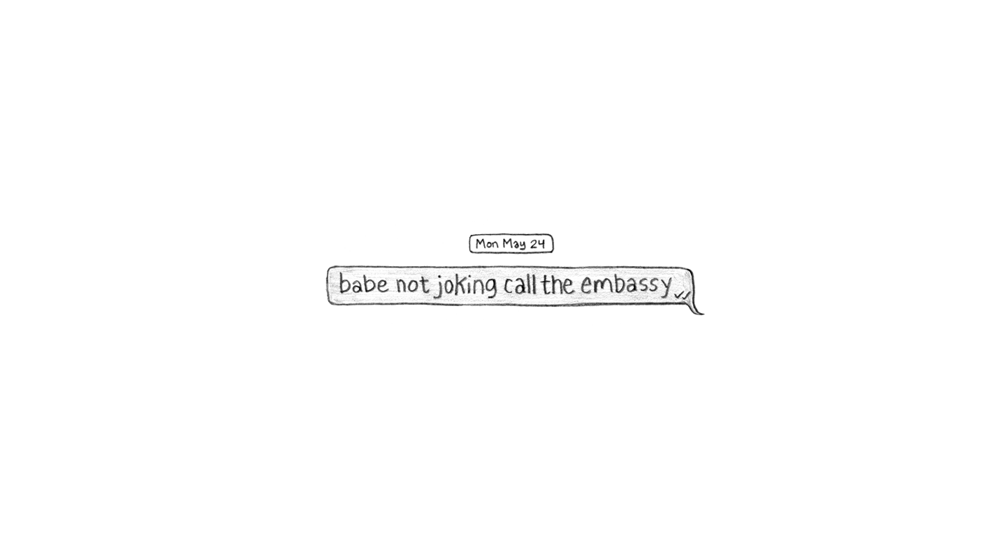 Text to Juliana: “babe not joking call the embassy.”
