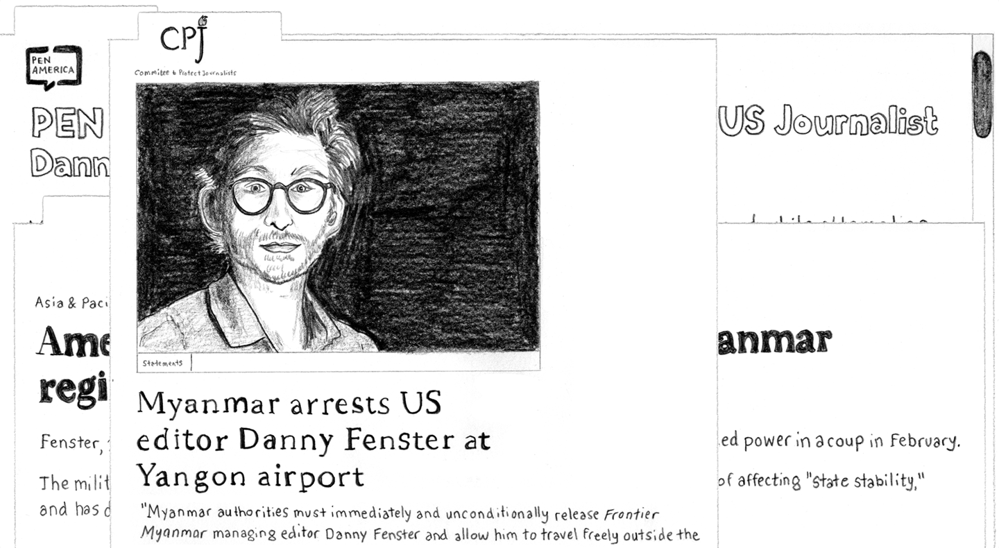 Committee to Protect Journalists “Myanmar arrests US editor Danny Fenster at Yangon airport Myanmar authorities must immediately and unconditionally release Frontier Myanmar managing editor Danny Fenster and allow him to travel freely outside the” [text is cut off]