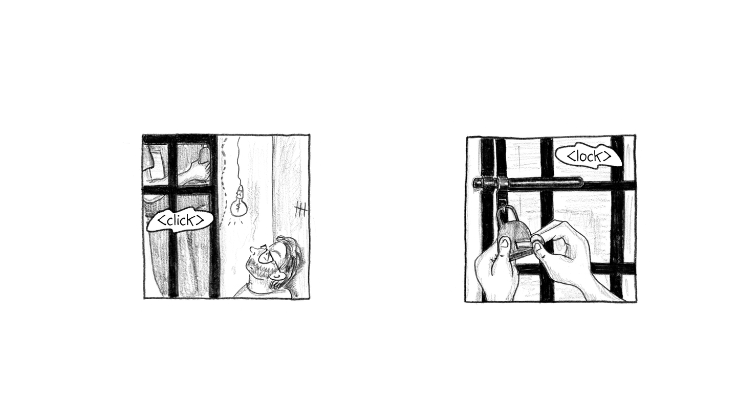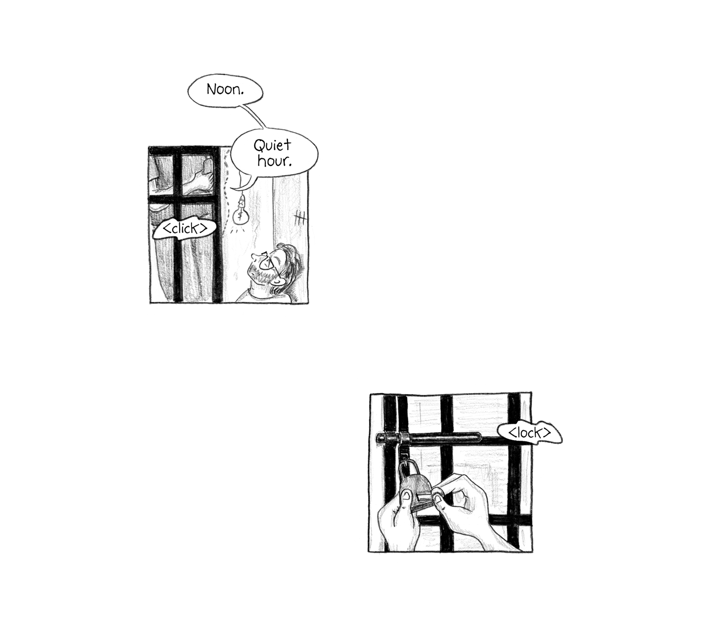 “Noon. Quiet Hour.” <click, lock>