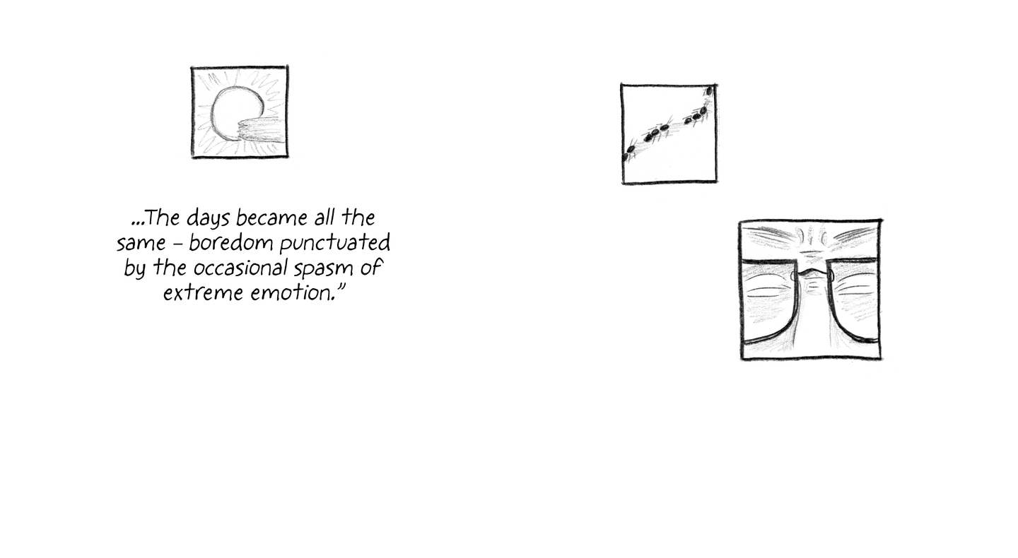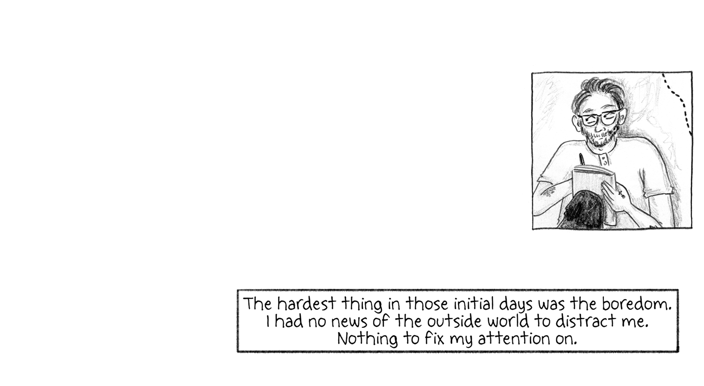 The hardest thing in those initial days was the boredom. I had no news of the outside world to distract me. Nothing to fix my attention on.