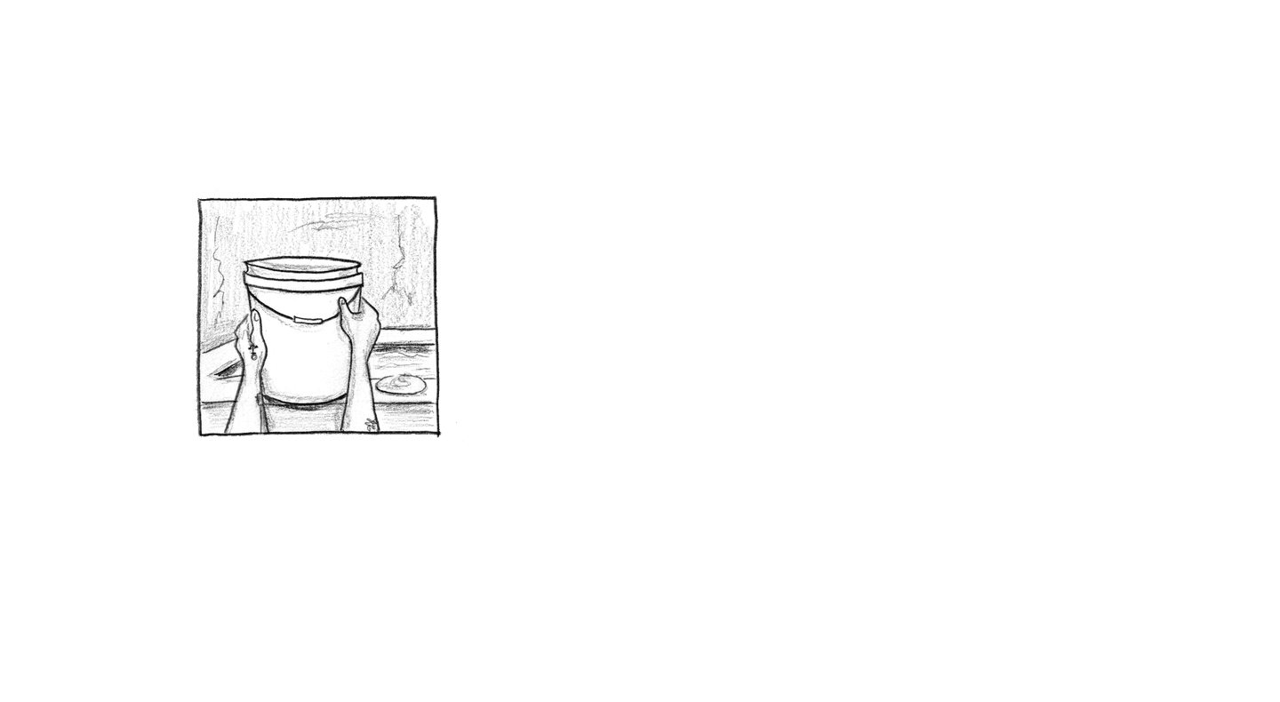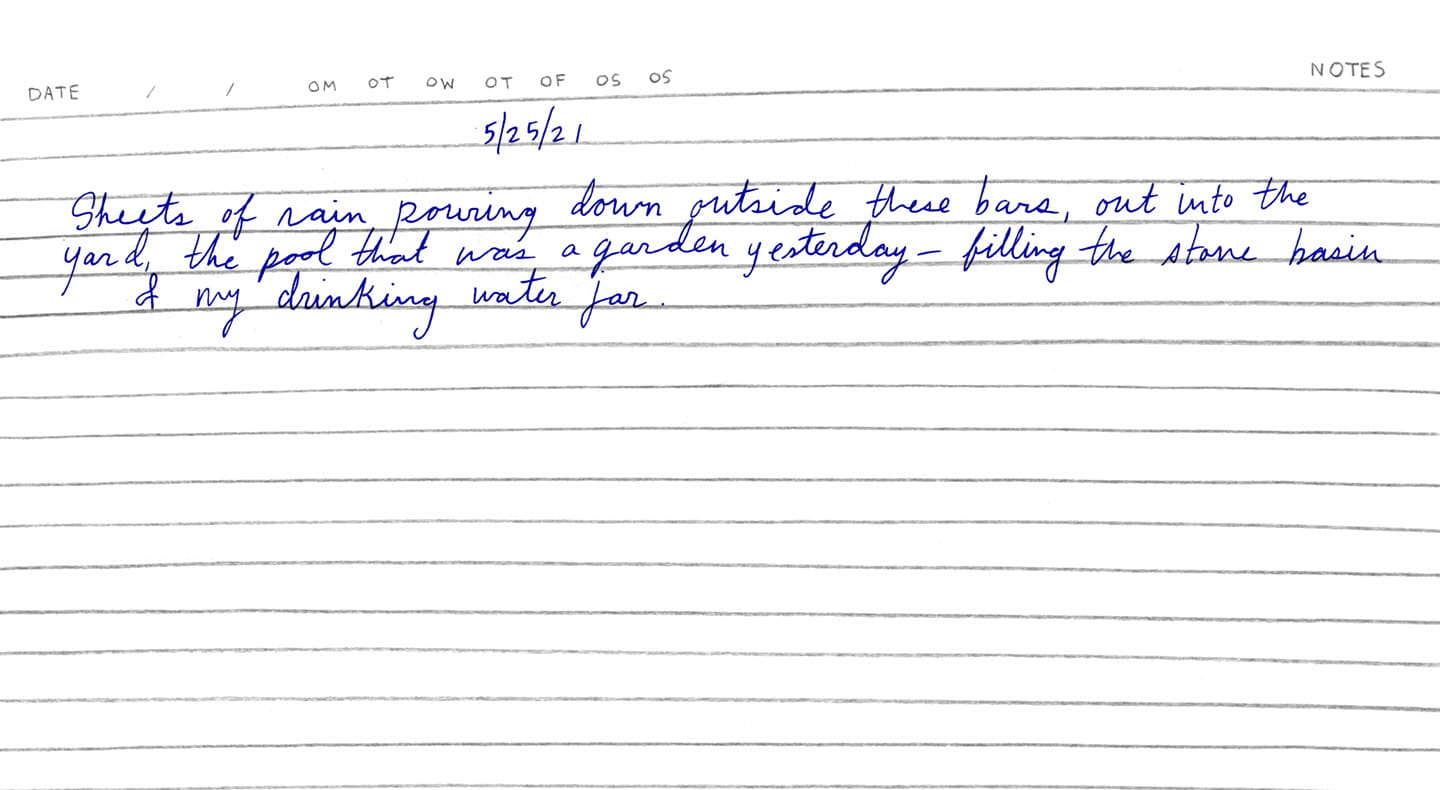 “Sheets of rain pouring down outside these bars, out into the yard, the pool that was a garden yesterday — filling the stone basin and my drinking water jar”