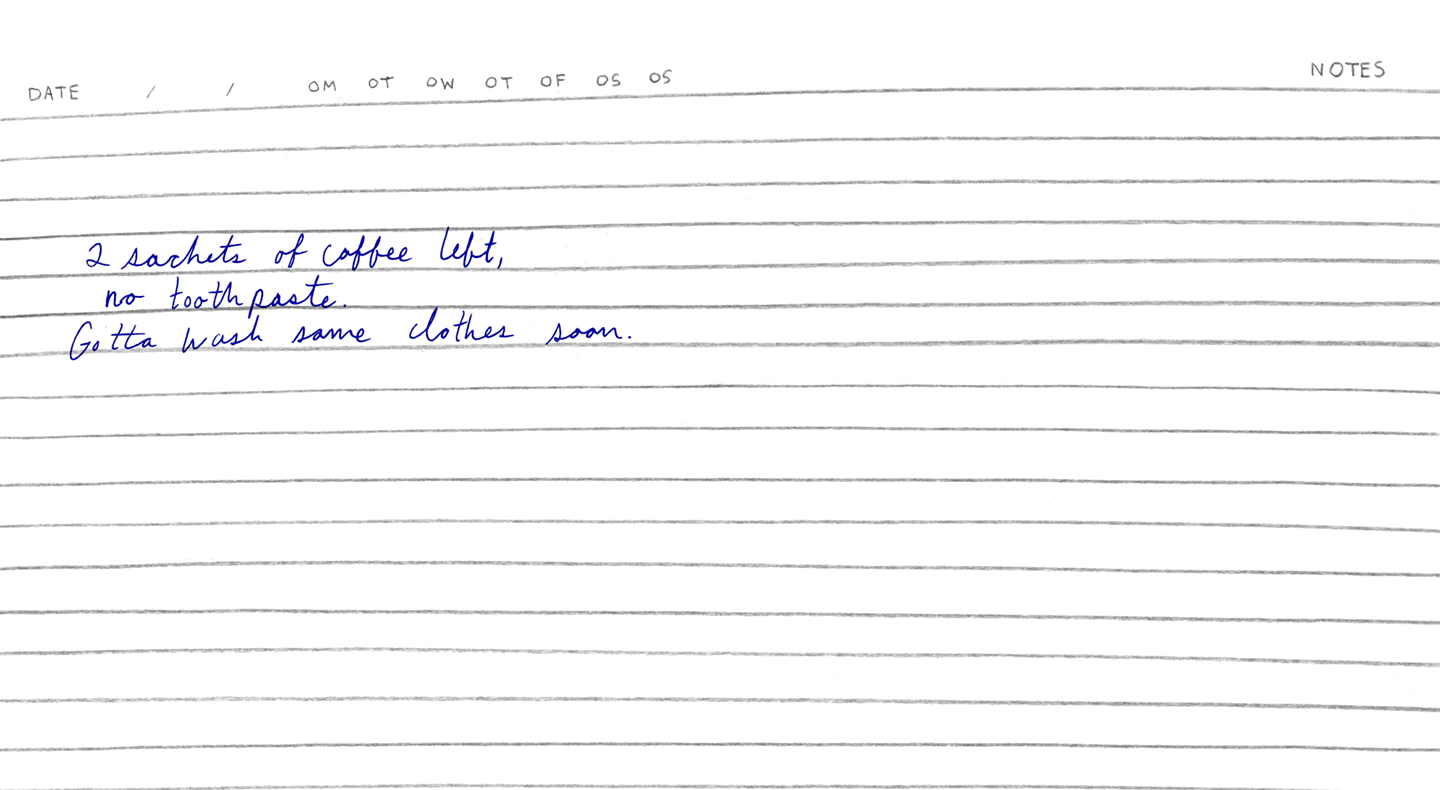 “2 sachets of coffee left, no toothpaste. Gotta wash some clothes soon.”