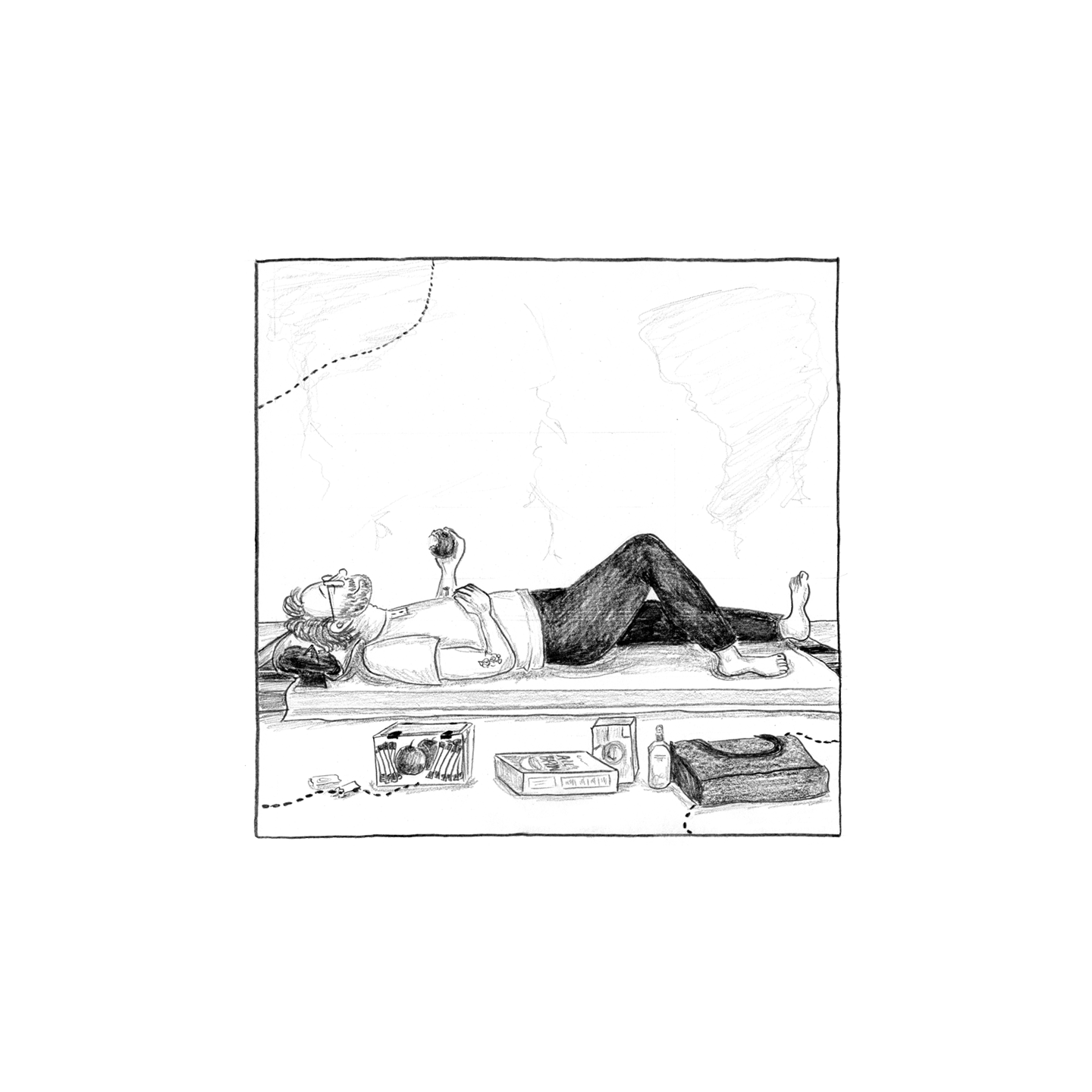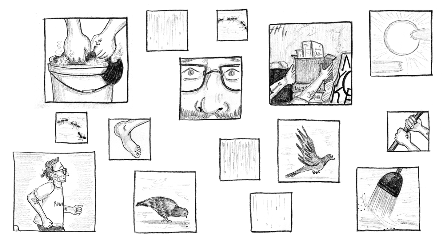 “Drifting always to the corner, its legs splayed akimbo, forming an X with its limp antennae, legs dangling, at ease, any tensions having fled, it looks like underneath, on its insect face, it must be smiling at its oblivion, although of course it may have died in a drowning suffocating panic, but now it's free.”