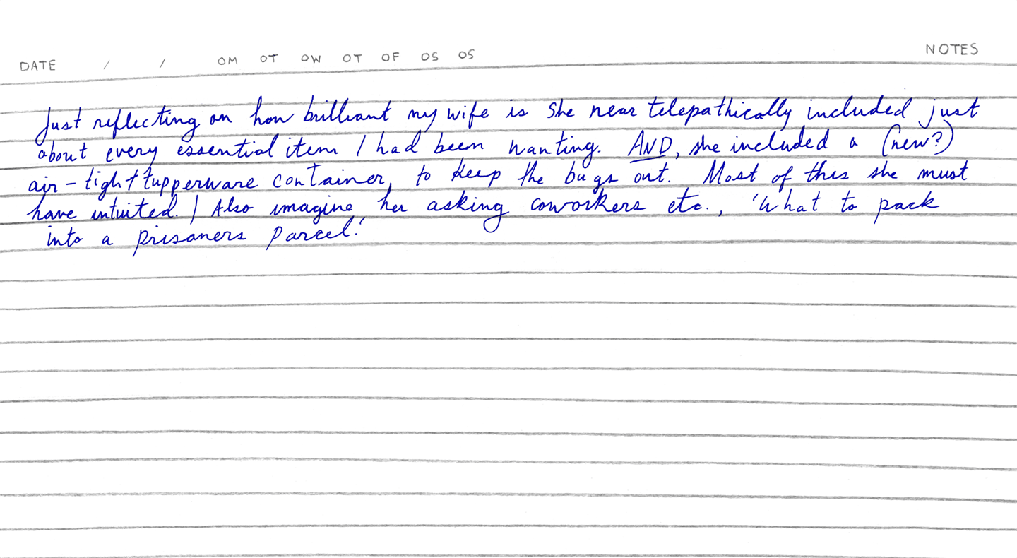 Journal entry: “Just reflecting on how brilliant my wife is. She near telepathically included just about every essential item I’d been wanting. And she included a (new?) air-tight tupperware container, to keep the bugs out. Most of this she must have intuited. I also imagine her asking coworkers etc., ‘What to pack into a prisoners parcel.’”