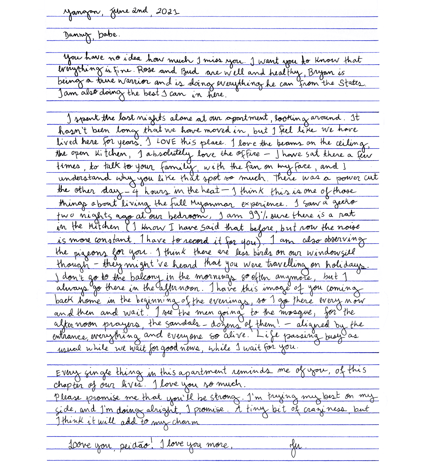 “Ju- I love and miss you so much. I am doing well physically and feeling more or less healthy — but mentally things are obviously rough…”