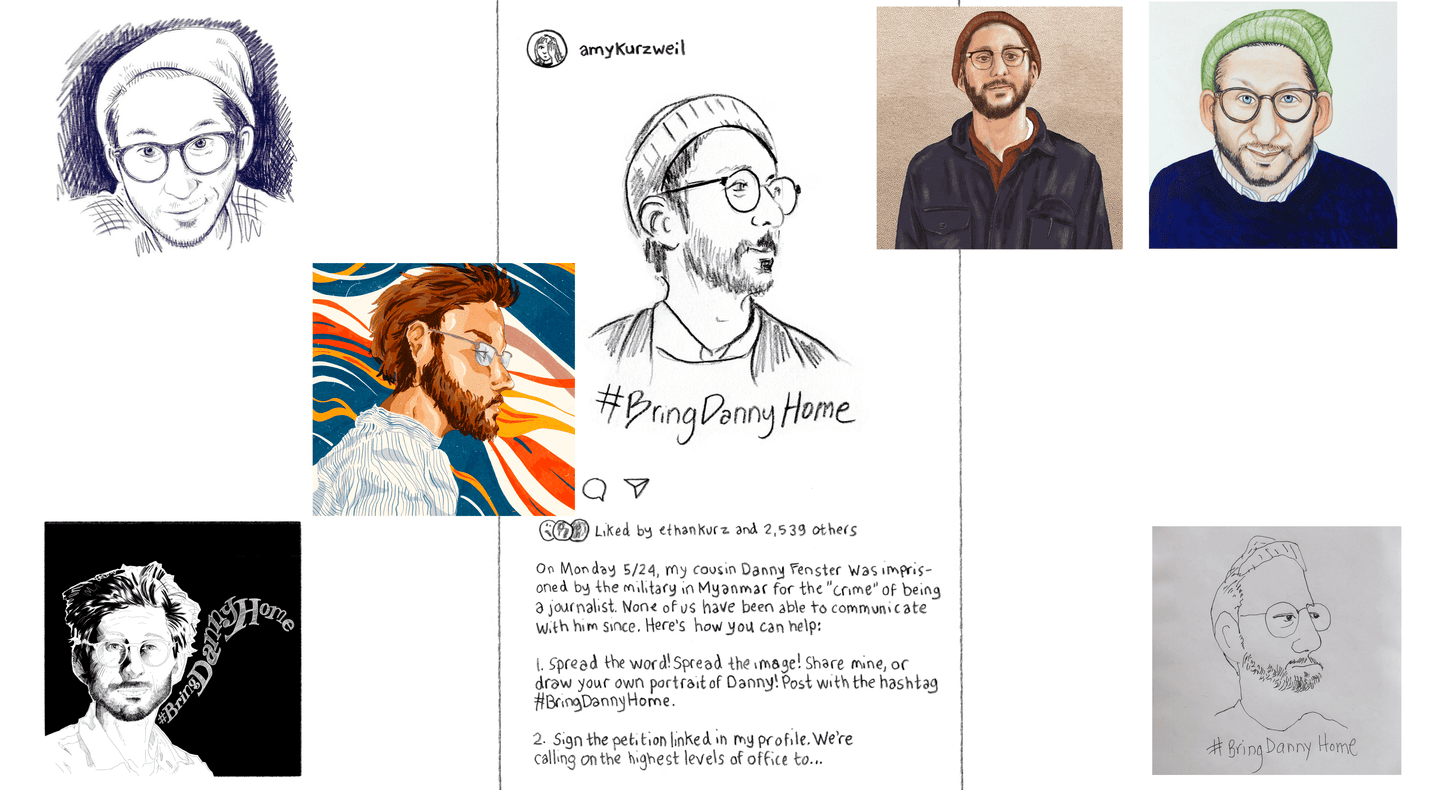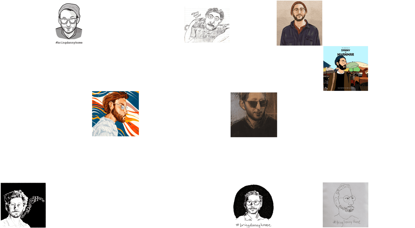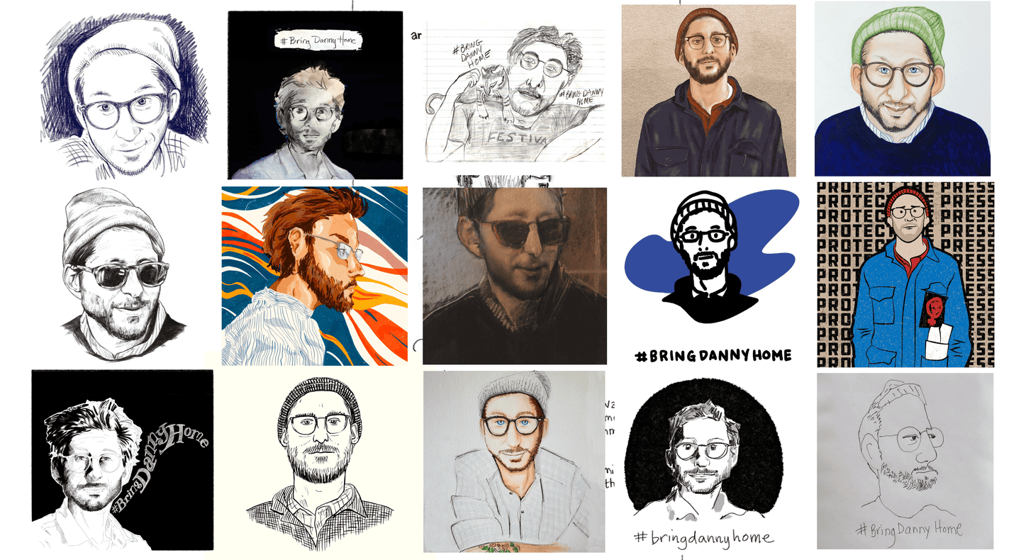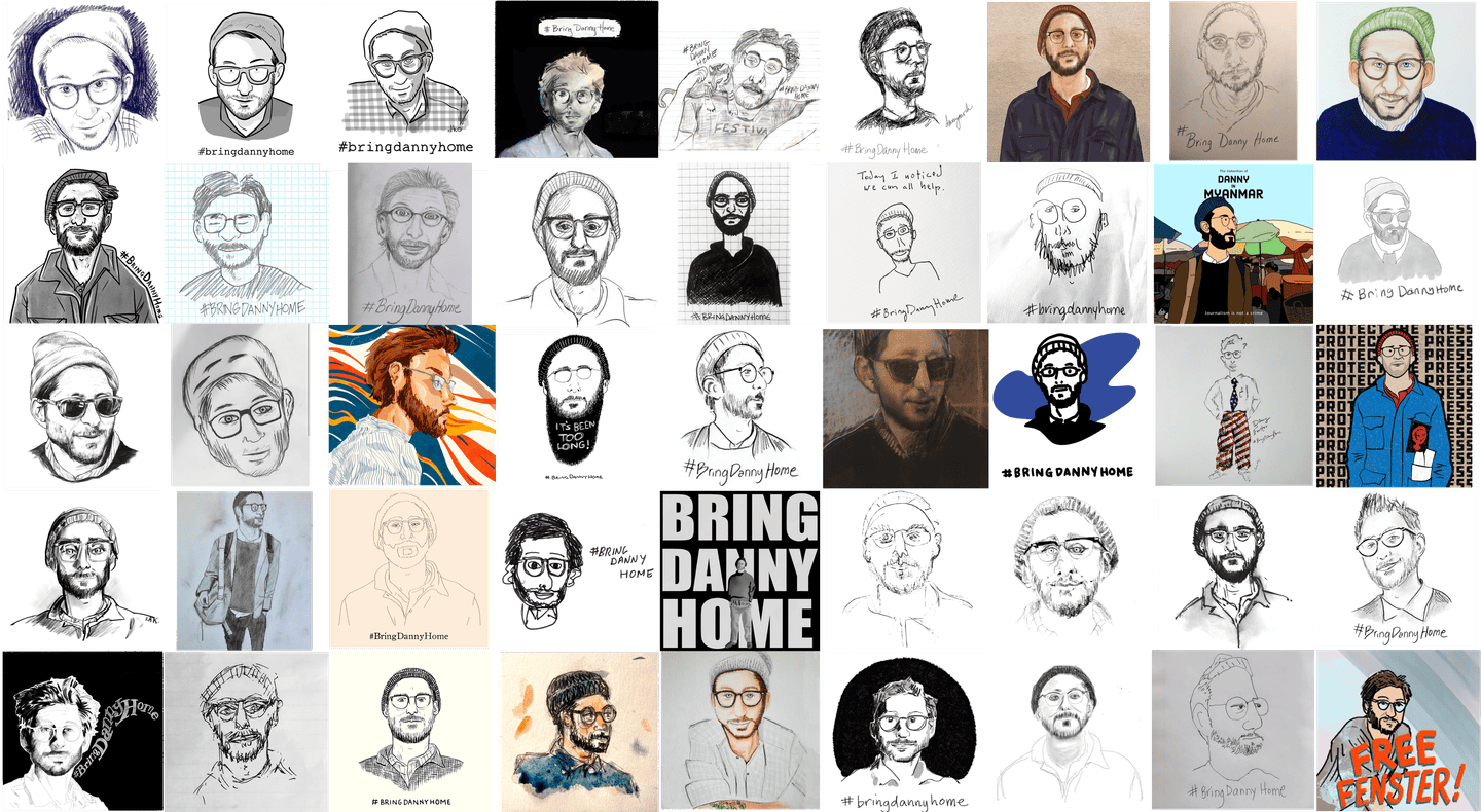 [A collage of social media posts featuring art of Danny’s face and the hashtag #BringDannyHome] One day, in a makeshift military court inside the prison, a sympathetic translator surreptitiously flashed me a screenshot.