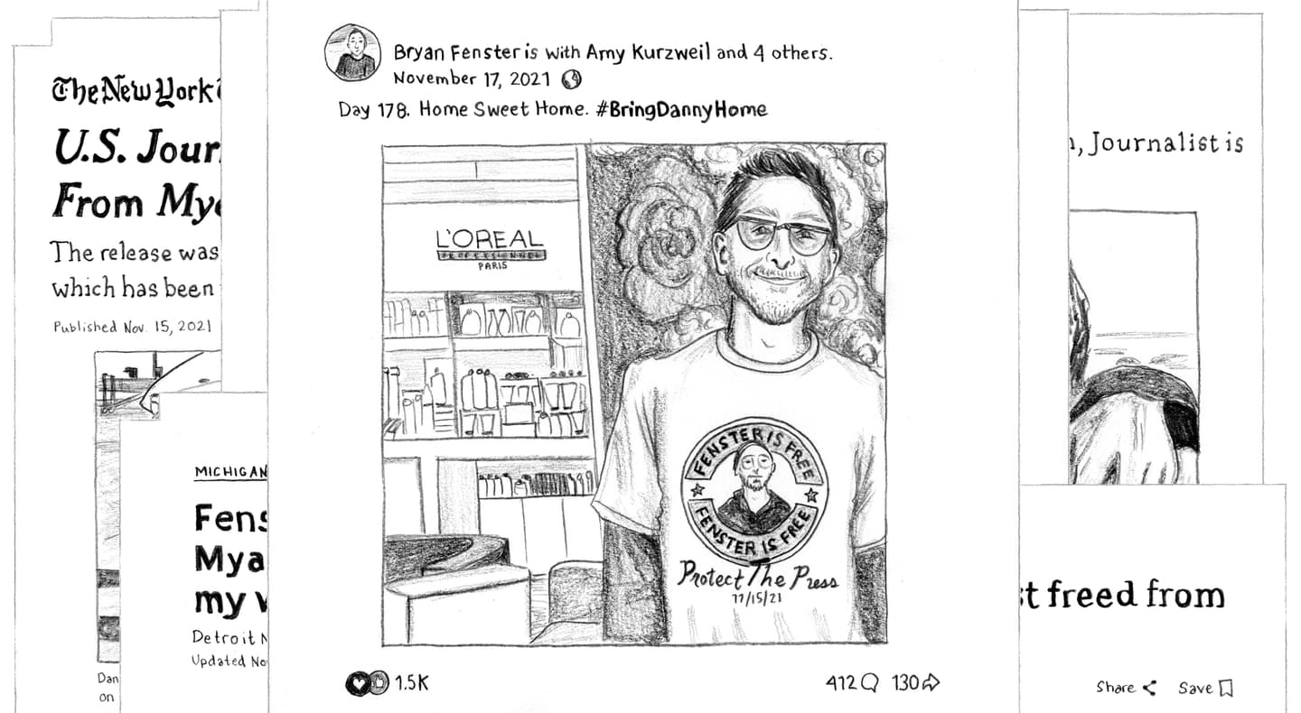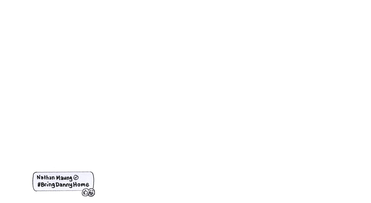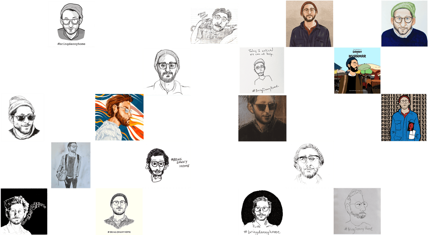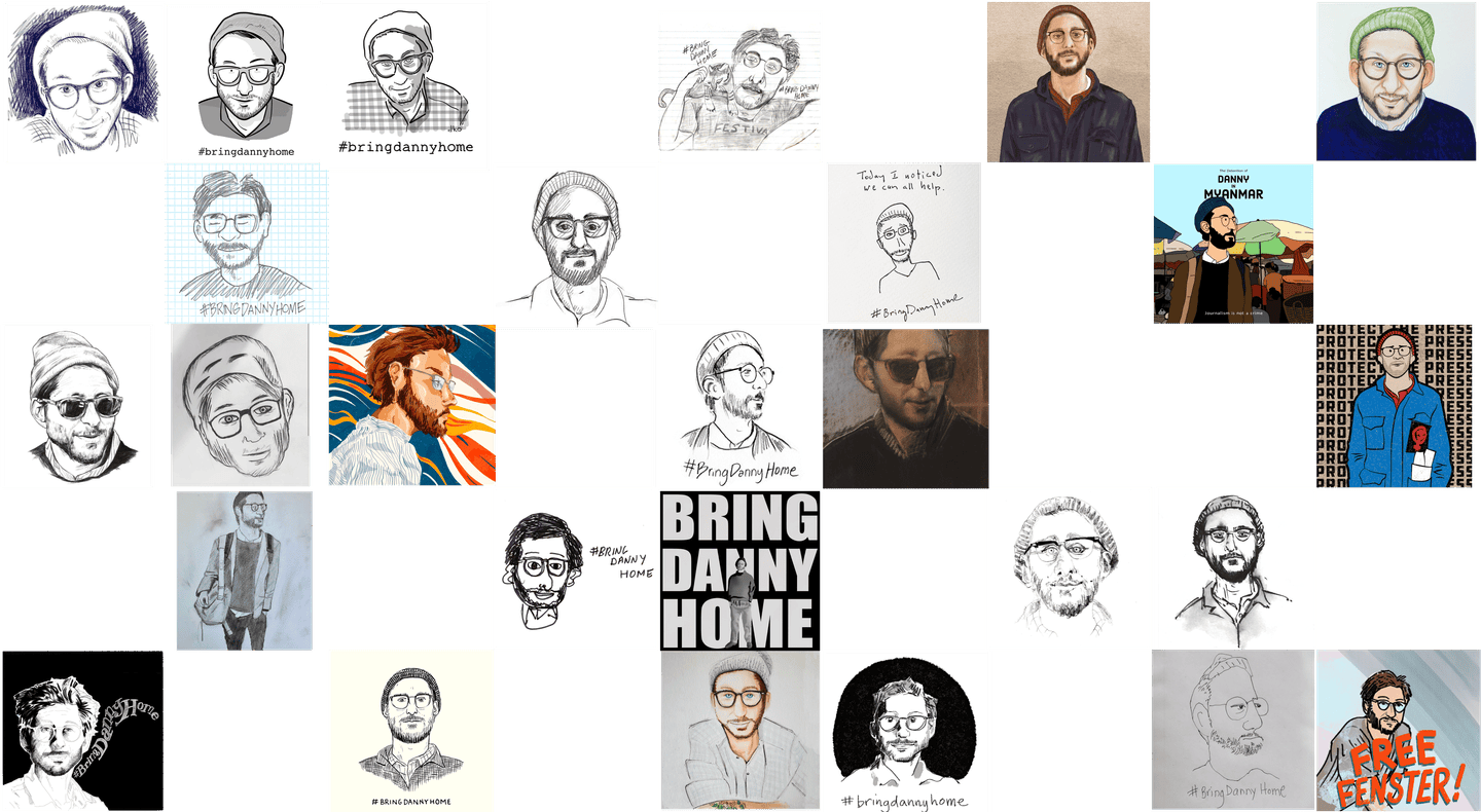 [A collage of social media posts featuring art of Danny’s face and the hashtag #BringDannyHome] One day, in a makeshift military court inside the prison, a sympathetic translator surreptitiously flashed me a screenshot.