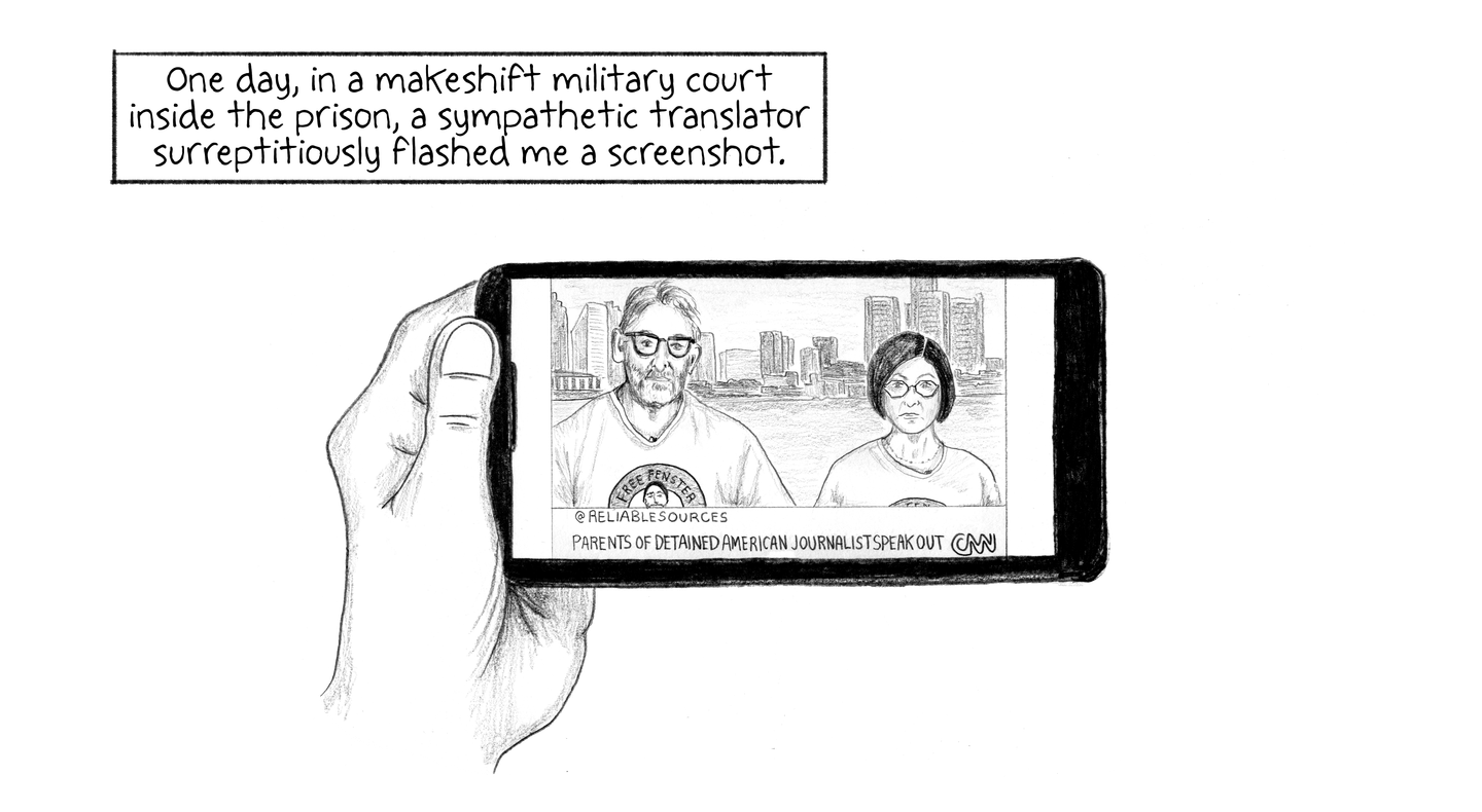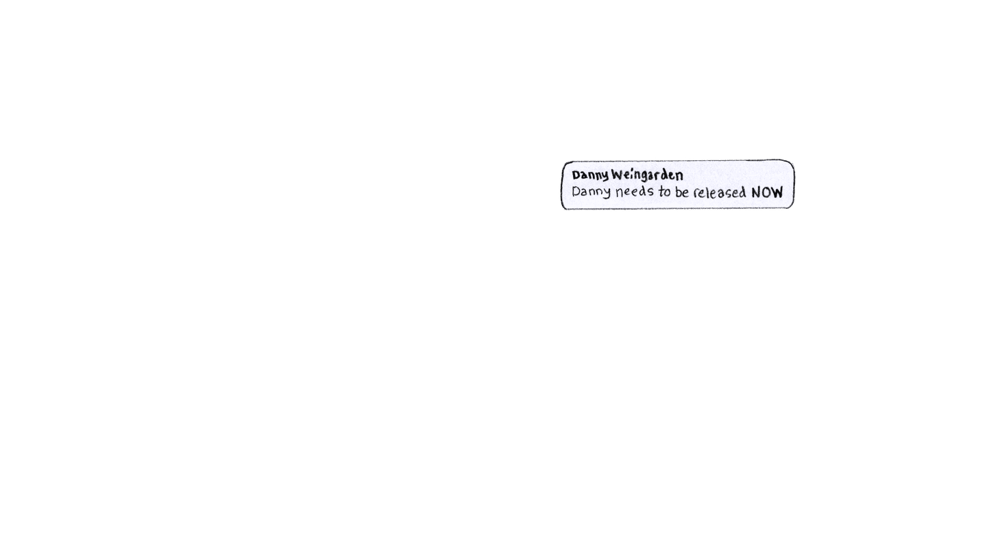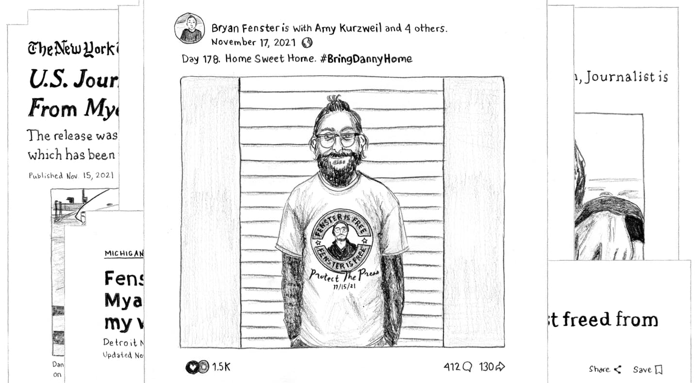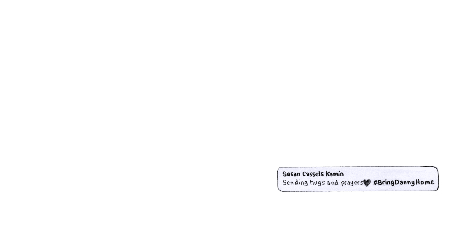 [A collage of social media posts featuring art of Danny’s face and the hashtag #BringDannyHome] One day, in a makeshift military court inside the prison, a sympathetic translator surreptitiously flashed me a screenshot.