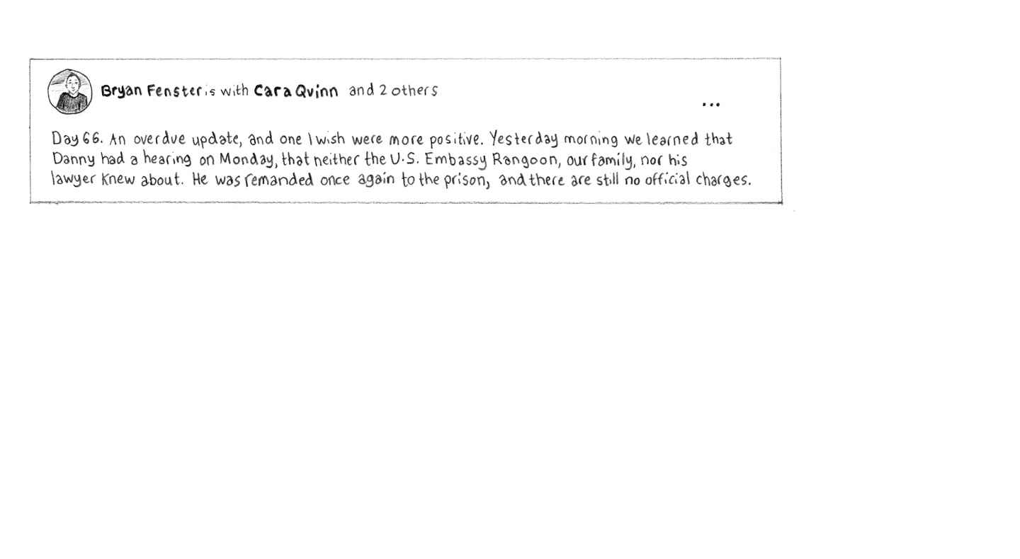 Facebook post: “Bryan Fenster is with Cara Quinn and 2 others Day 66. An overdue update, and one I wish were more positive. Yesterday morning we learned that Danny had a hearing on Monday, that neither the U.S. Embassy Rangoon, our family, nor his lawyer knew about. He was remanded once again to the prison, and there are still no official charges.”