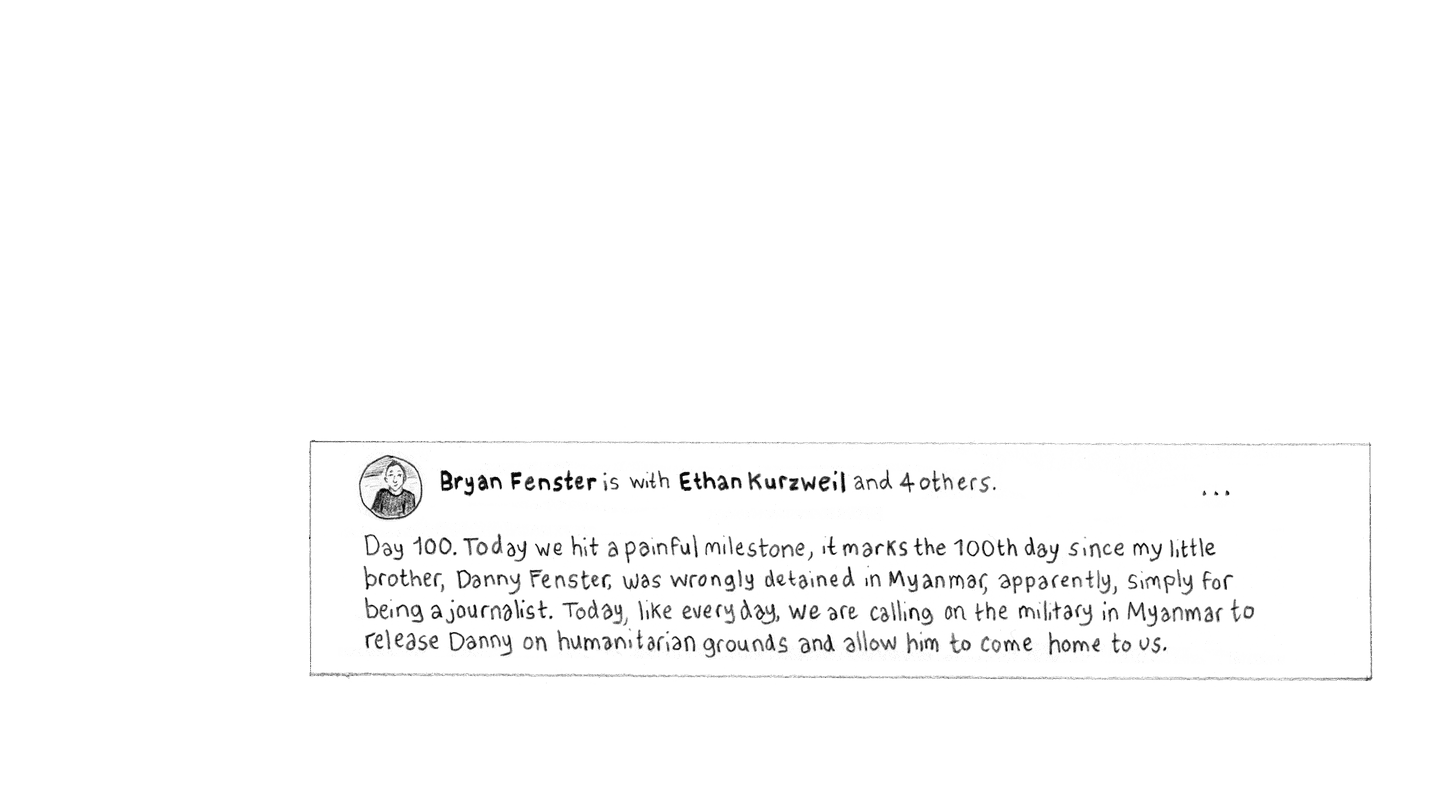“Bryan Fenster is with Ethan Kurzweil and 4 others. Day 100. Today we hit a painful milestone, it marks the 100th day since my little brother, Danny Fenster, was wrongly detained in Myanmar, apparently, simply for being a journalist. Today, like every day, we are calling on the military in Myanmar to release Danny on humanitarian grounds and allow him to come home to us.”