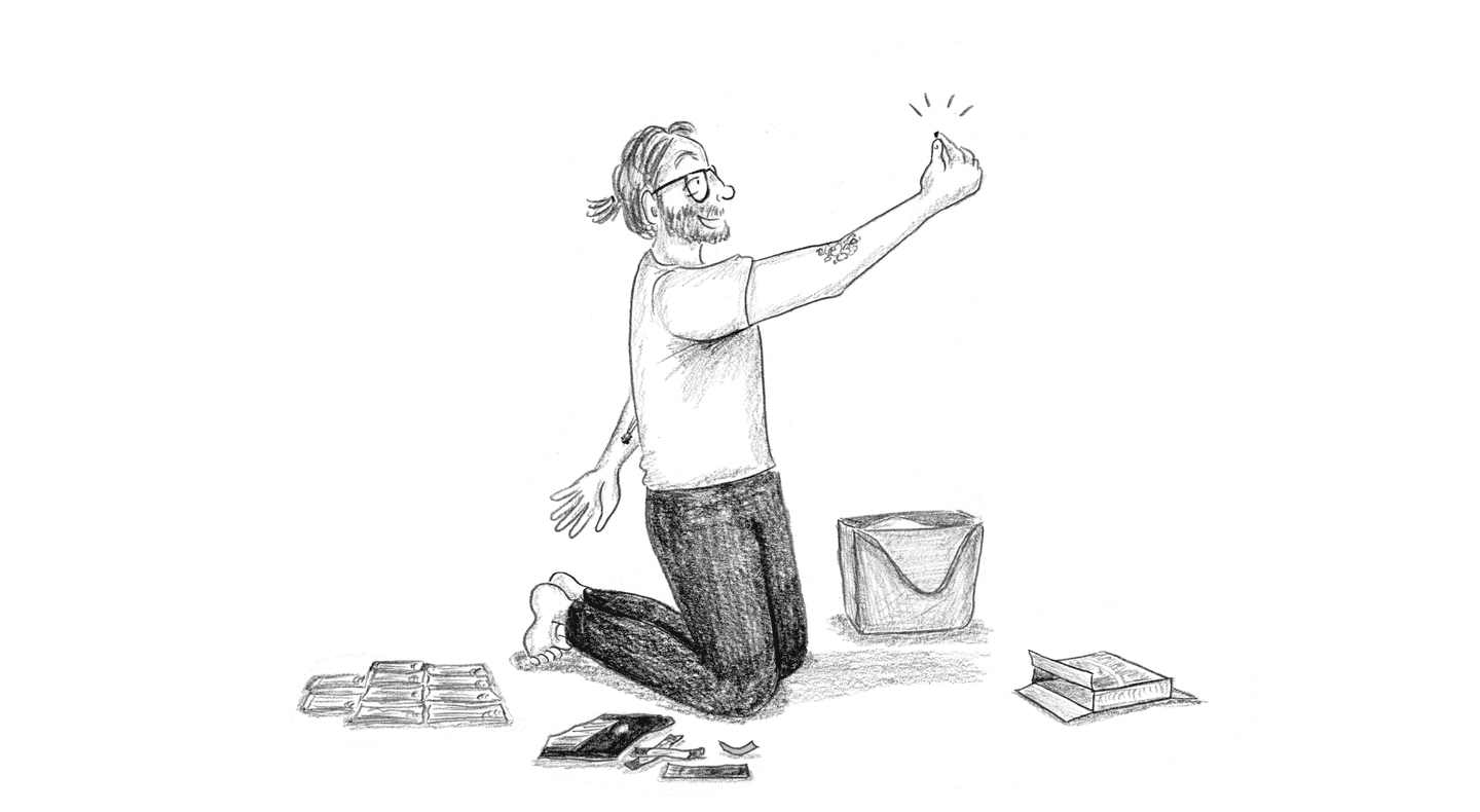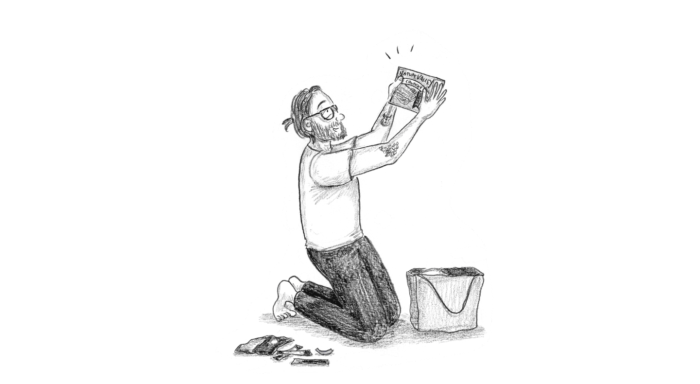 [Danny takes out the box of granola bars, opens it, and dumps the wrapped bars out. He examines and touches each bar, clearly looking for something hidden. He looks dismayed, and then peers inside the empty box to discover a small microSD card taped inside.]