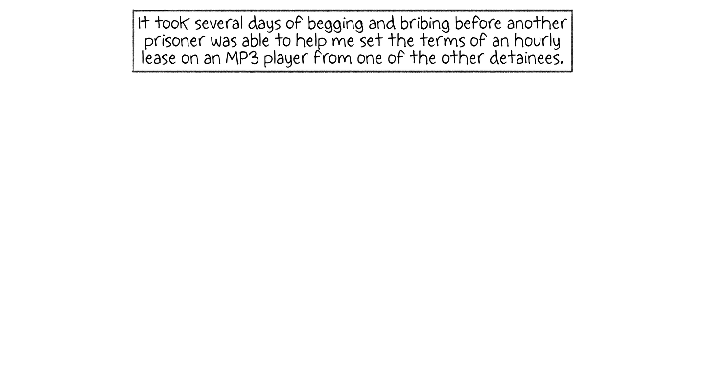 It took several days of begging and bribing before another prisoner was able to help me set the terms of an hourly lease on an MP3 player from one of the other detainees.