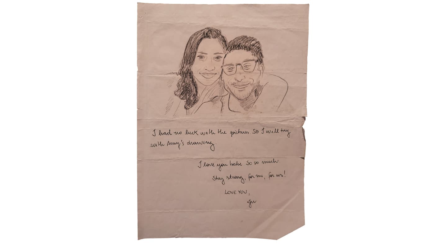 Drawing on paper: “I had no luck with the pictures so I will try again with Amy’s drawing. I love you babe. So so much. Stay strong, for me, for us! LOVE YOU, Ju”
