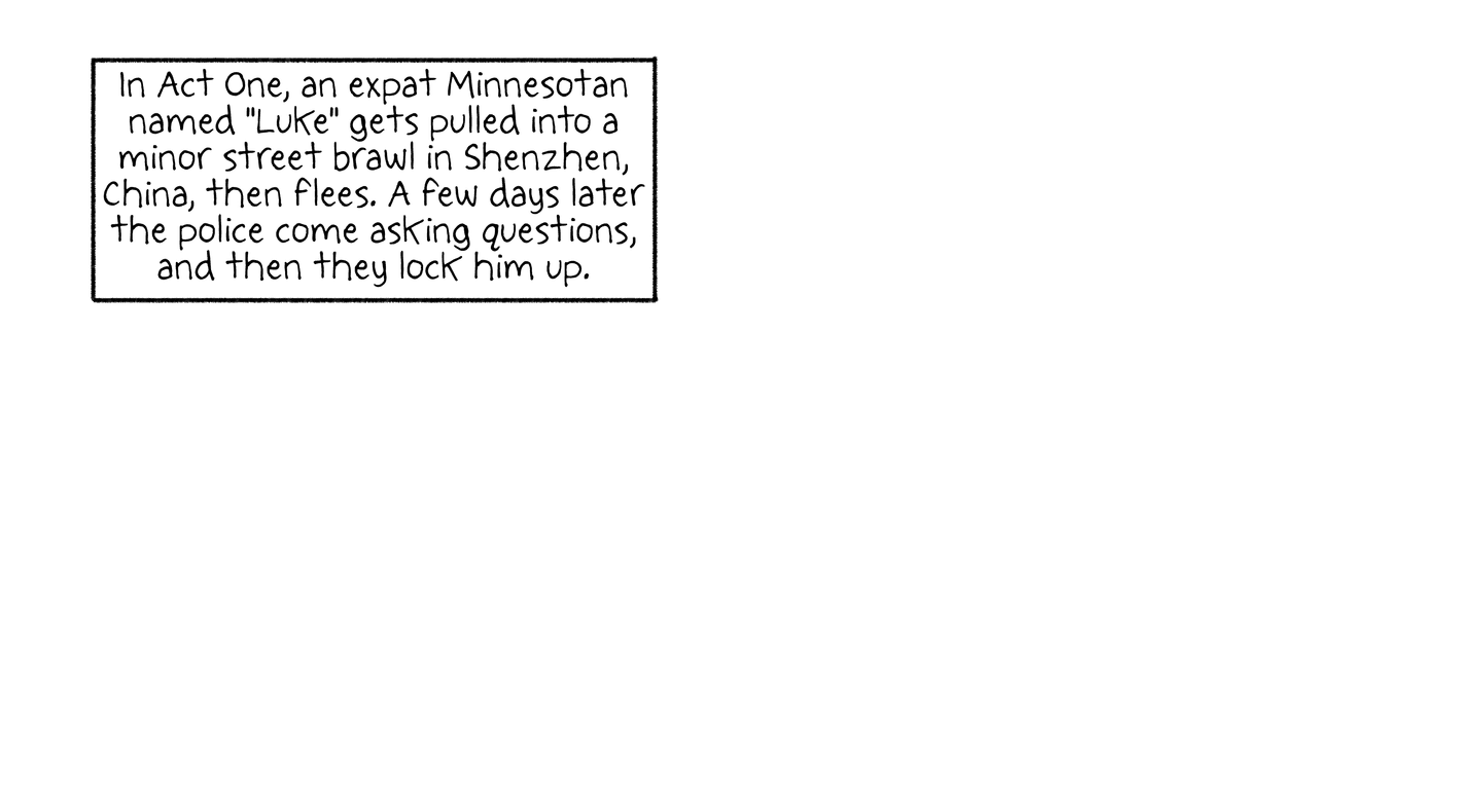 In Act One, an expat Minnesotan named "Luke" gets pulled into a minor street brawl in Shenzhen, China, then flees. A few days later the police come asking questions, and then they lock him up.