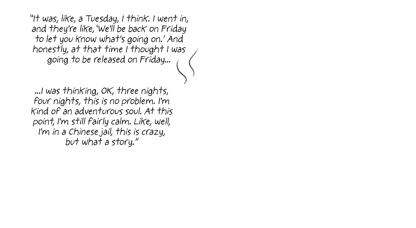 “... I was thinking, OK, three nights, four nights, this is no problem. I'm kind of an adventurous soul. At this point, I'm still fairly calm. Like, well, I'm in a Chinese jail, this is crazy, but what a story.”