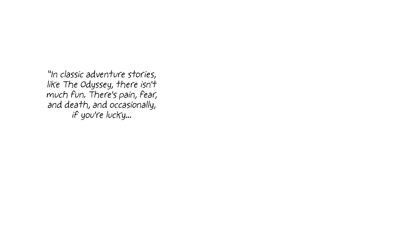 “The cell was a rectangle, 10 by 15 feet… During storms, you couldn't hide from the rain blowing in, so everyone would get drenched… …up at 7, then breakfast… …thin rice water broth… … nap from 11:30 to 1:30… …The days became all the same — boredom punctuated by the occasional spasm of extreme emotion.” “In classic adventure stories, like The Odyssey, there isn't much fun. There's pain, fear, and death, and occasionally, if you're lucky… …small transformations.”
