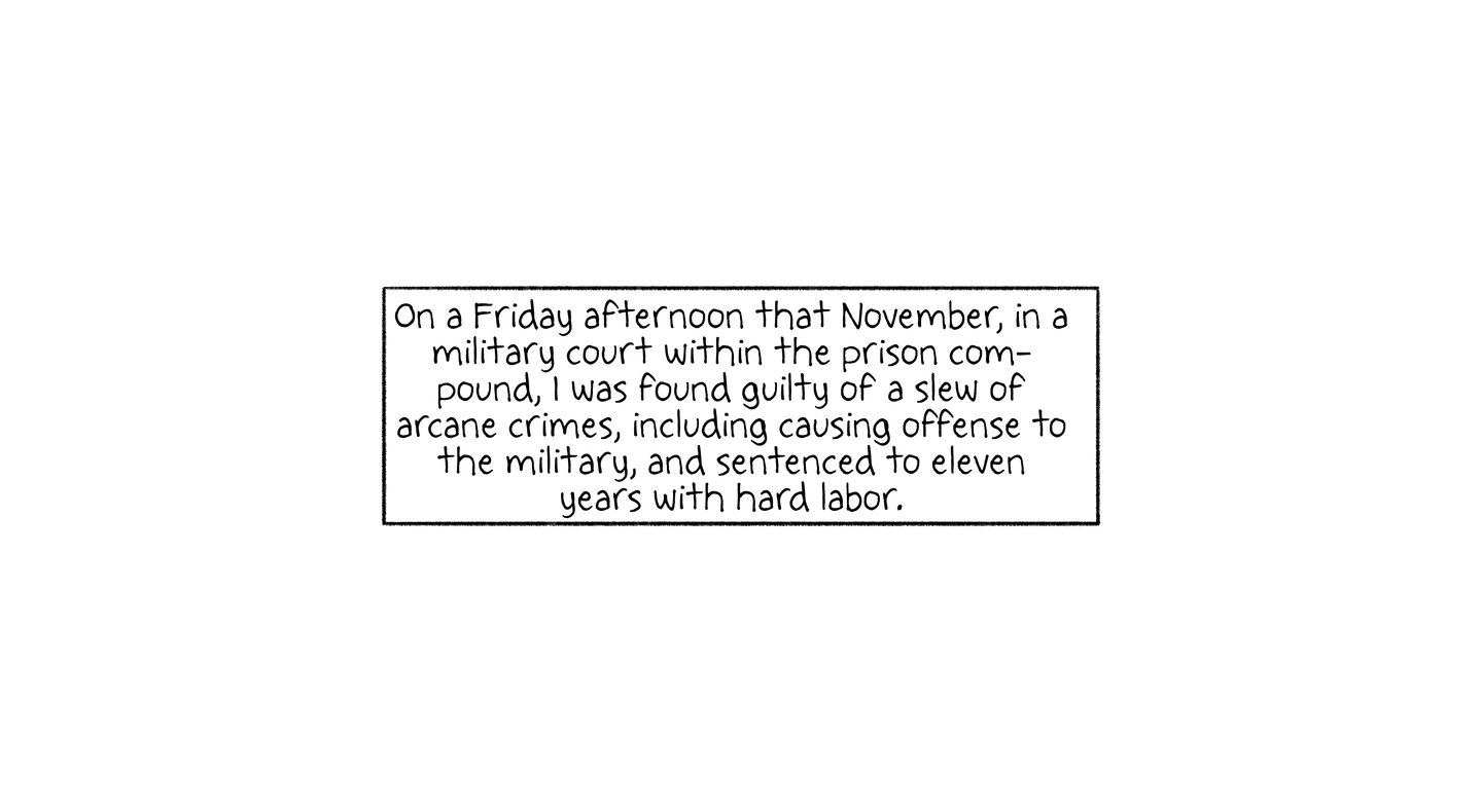 On a Friday afternoon that November, in a military court within the prison compound, I was found guilty of a slew of arcane crimes, including causing offense to the military, and sentenced to eleven years with hard labor.