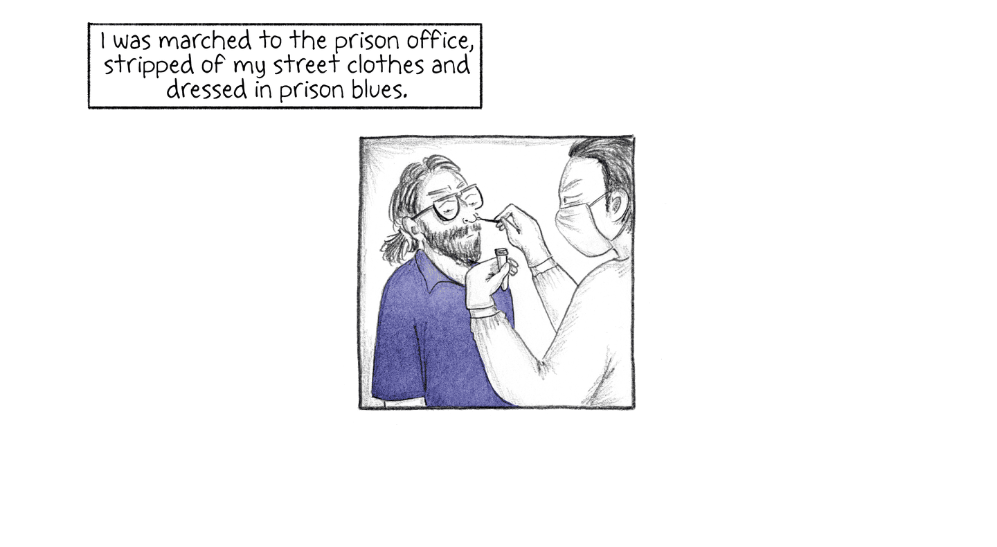 I was marched to the prison office, stripped of my street clothes and dressed in prison blues.