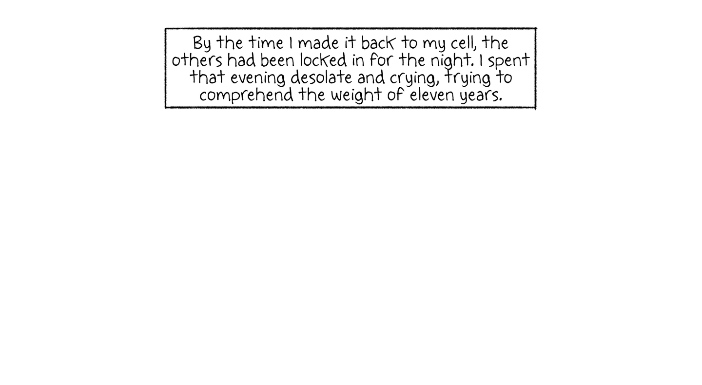 By the time I made it back to my cell, the others had been locked in for the night. I spent that evening desolate and crying, trying to comprehend the weight of eleven years.