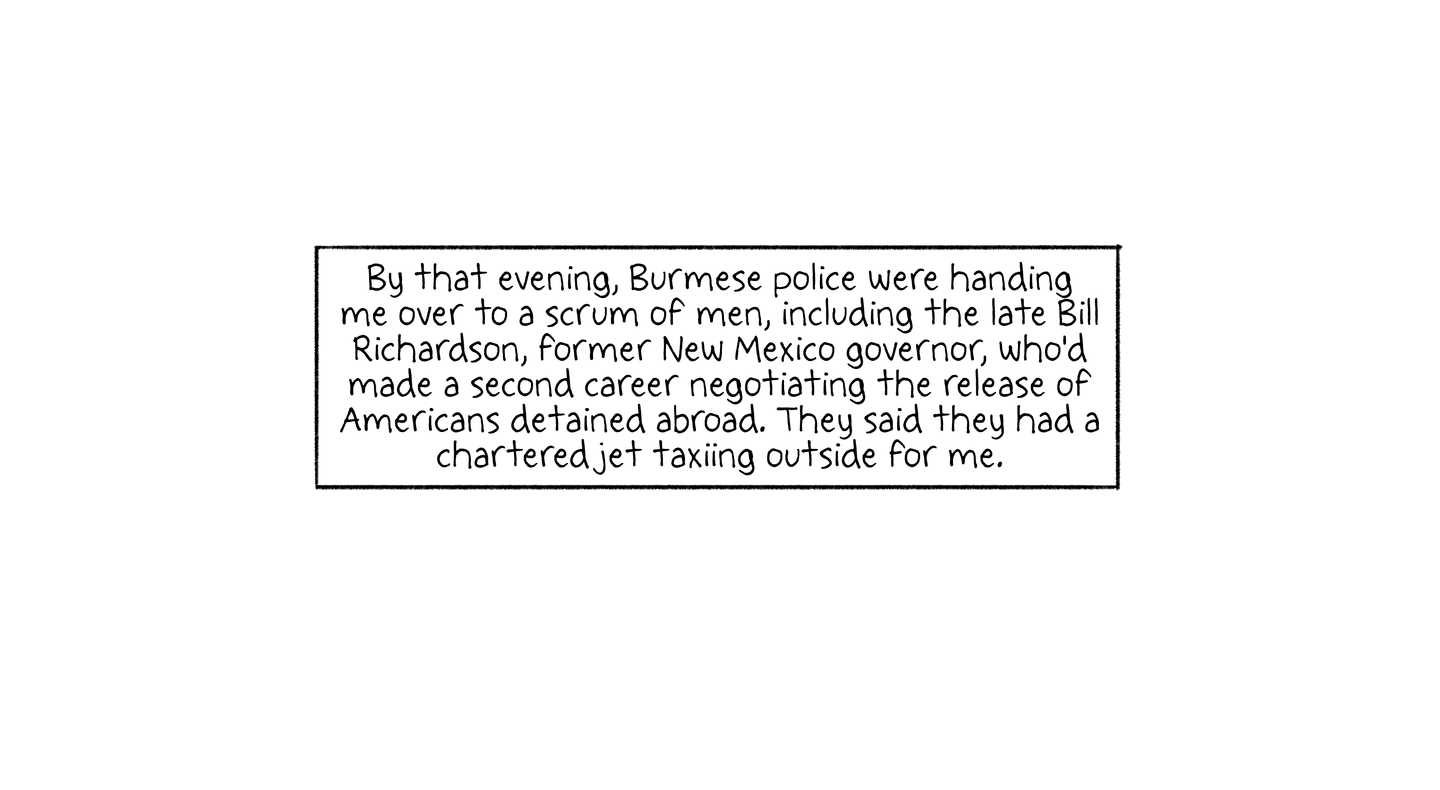 By that evening, Burmese police were handing me over to a scrum of men, including the late Bill Richardson, former New Mexico governor, who'd made a second career negotiating the release of Americans detained abroad. They said they had a chartered jet taxing outside for me.