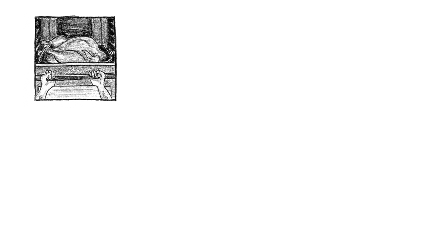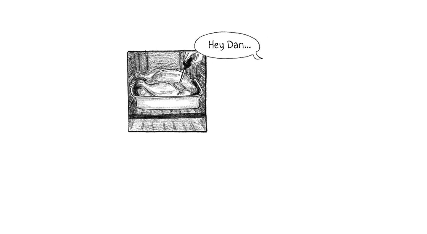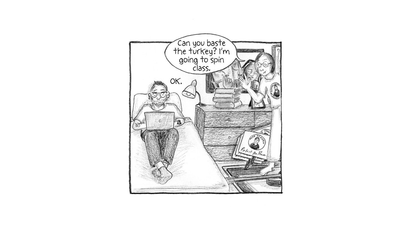 “Hey Dan? Can you baste the turkey? I'm going to spin class.” “OK.” “And the Rubins are downstairs – they want to say hi. The Detroit Jewish News will stop by at 4. They just want a picture, then they'll leave us alone.” “OK, Ma—” “What time does she land?” “Soon.”