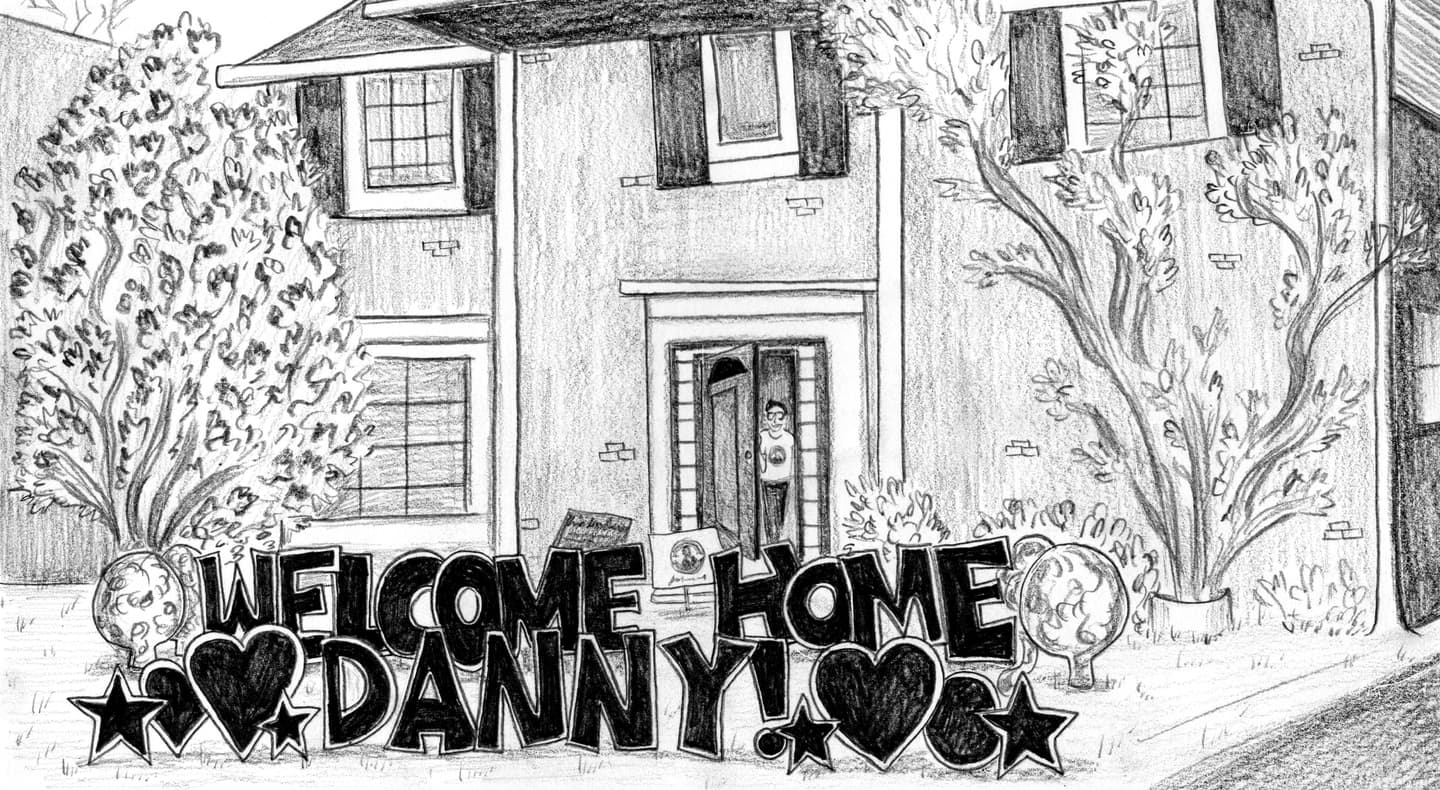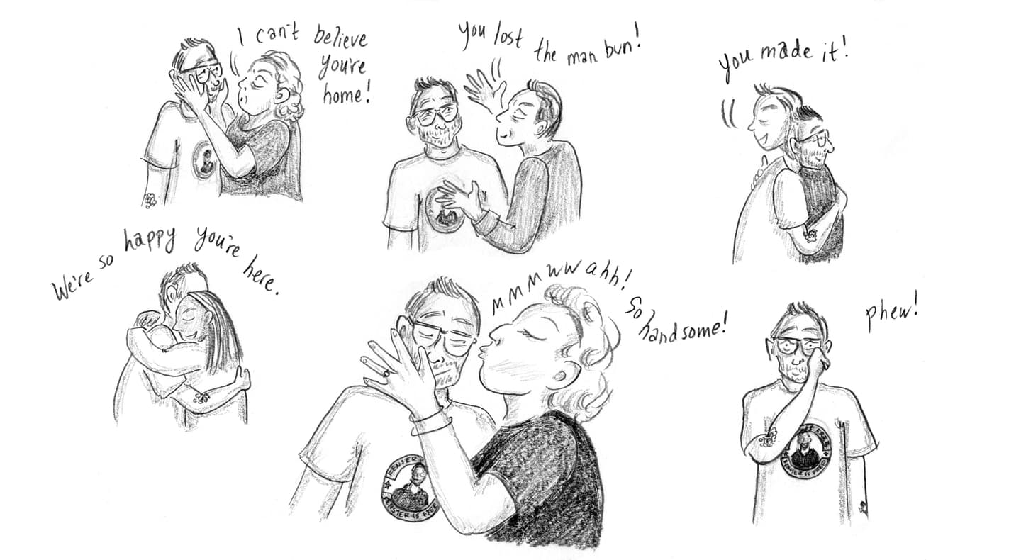 “Danny!” “I can’t believe you’re home!” “You lost the man bun!” “You made it!” “We’re so happy you’re here.” “Mmmmwah! So handsome!” “Phew!”